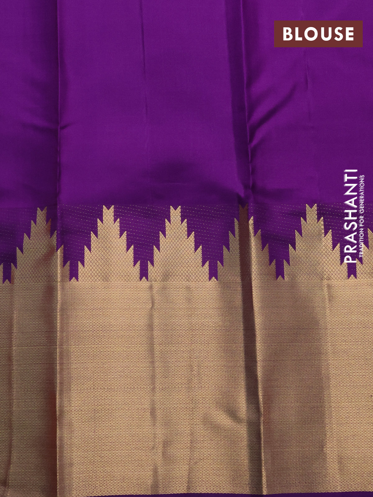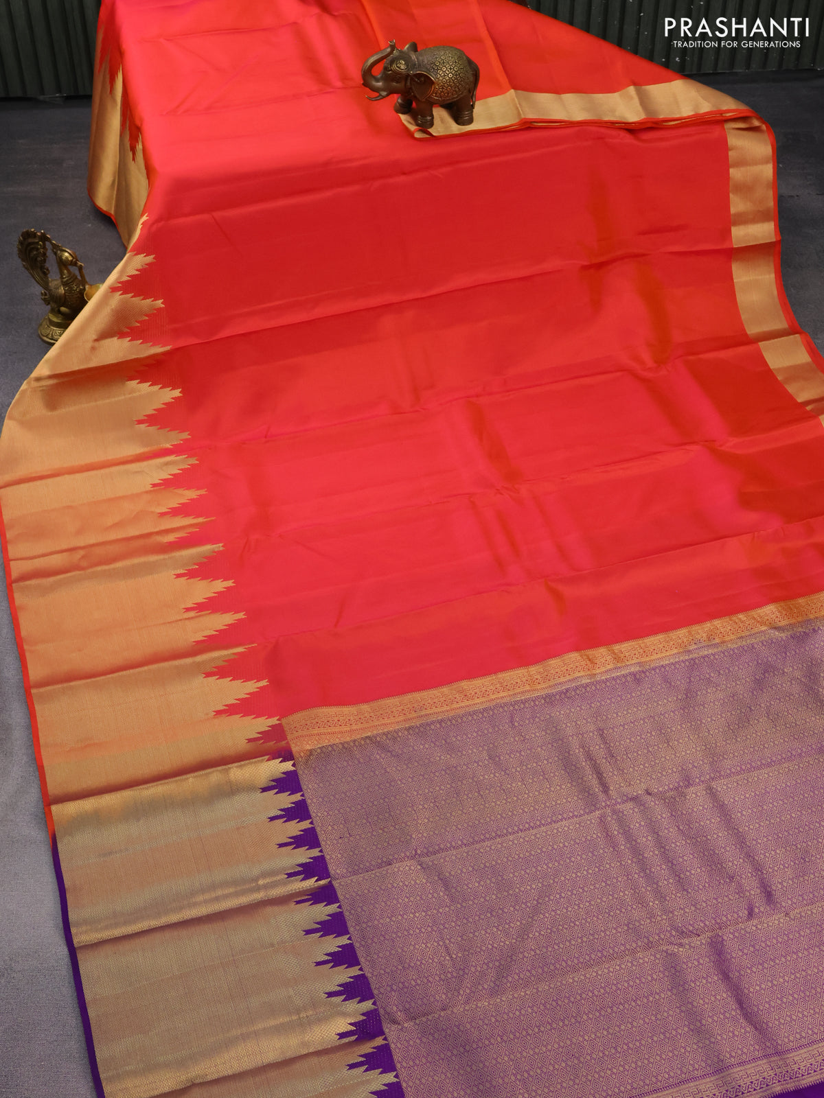 Pure kanchipuram silk saree dual shade of pinkish orange and violet with plain body and temple design zari woven border