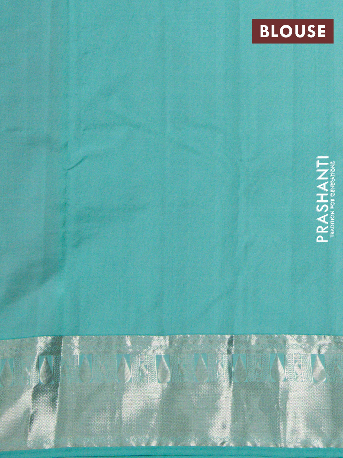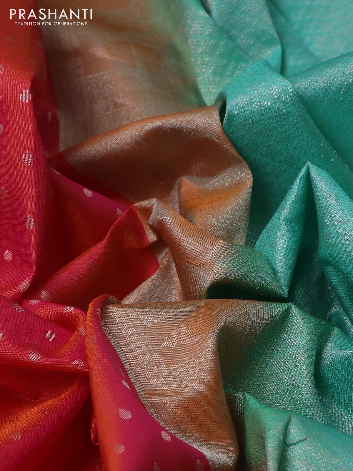 Pure kanchipuram silk saree dual shade of pinksh orange and teal blue with allover silver zari woven 1000 butta weaves and rich zari woven border