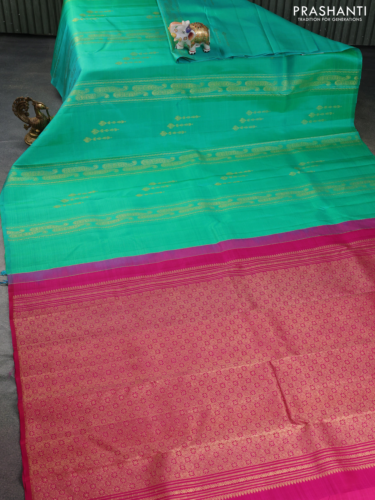 Pure kanchipuram silk saree dual shade of teal bluish green and pink with allover zariw weaves & buttas in borderless style