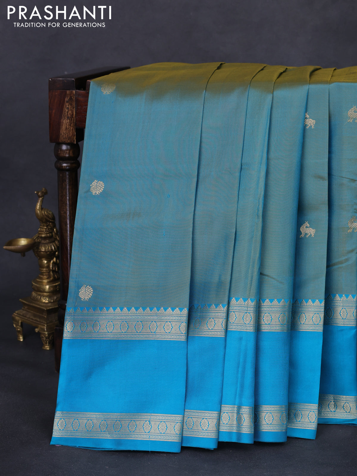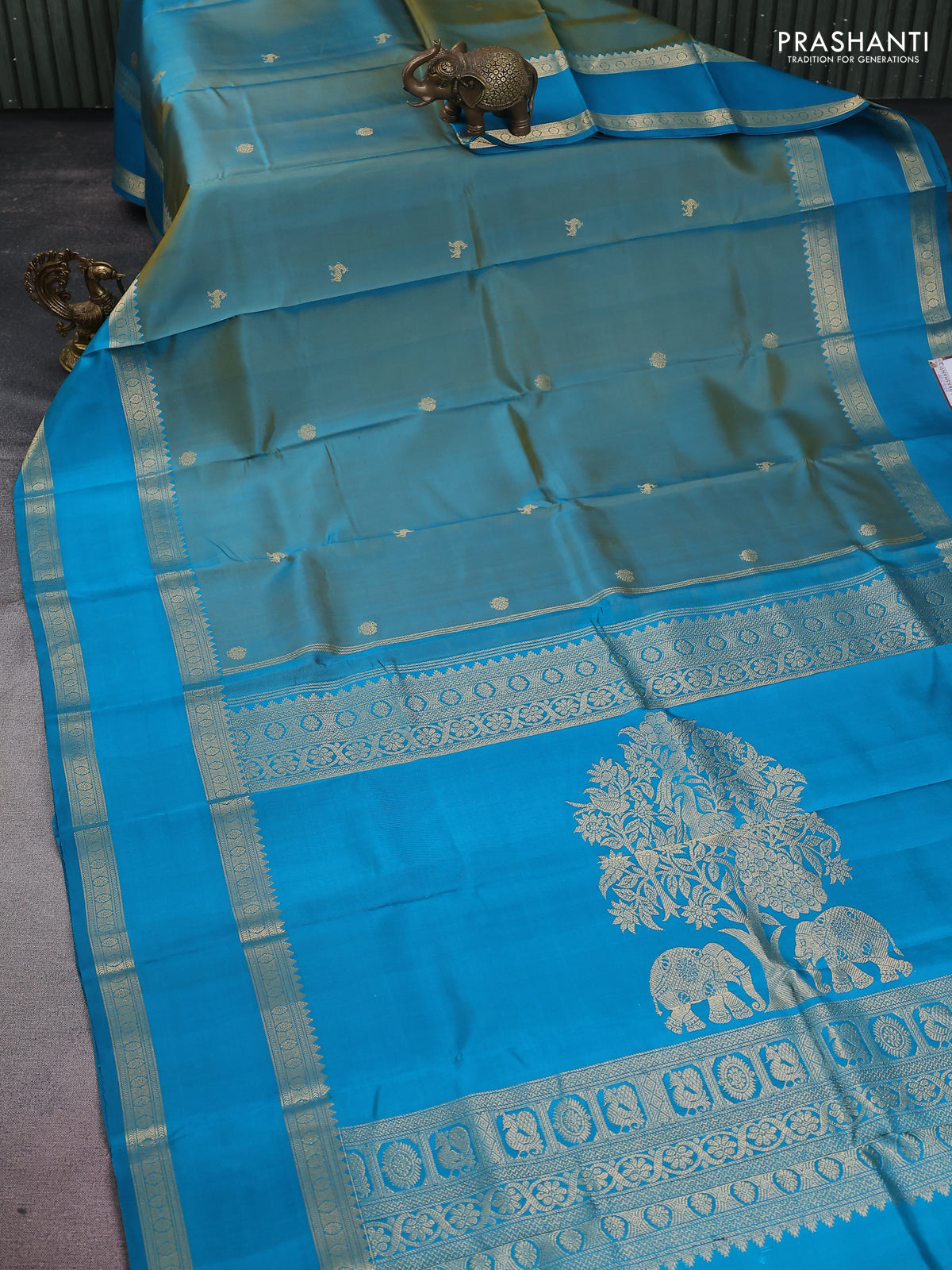 Pure kanchipuram silk saree dual shade of teal bluish green and teal blue with zari woven buttas and long rettapet zari woven border