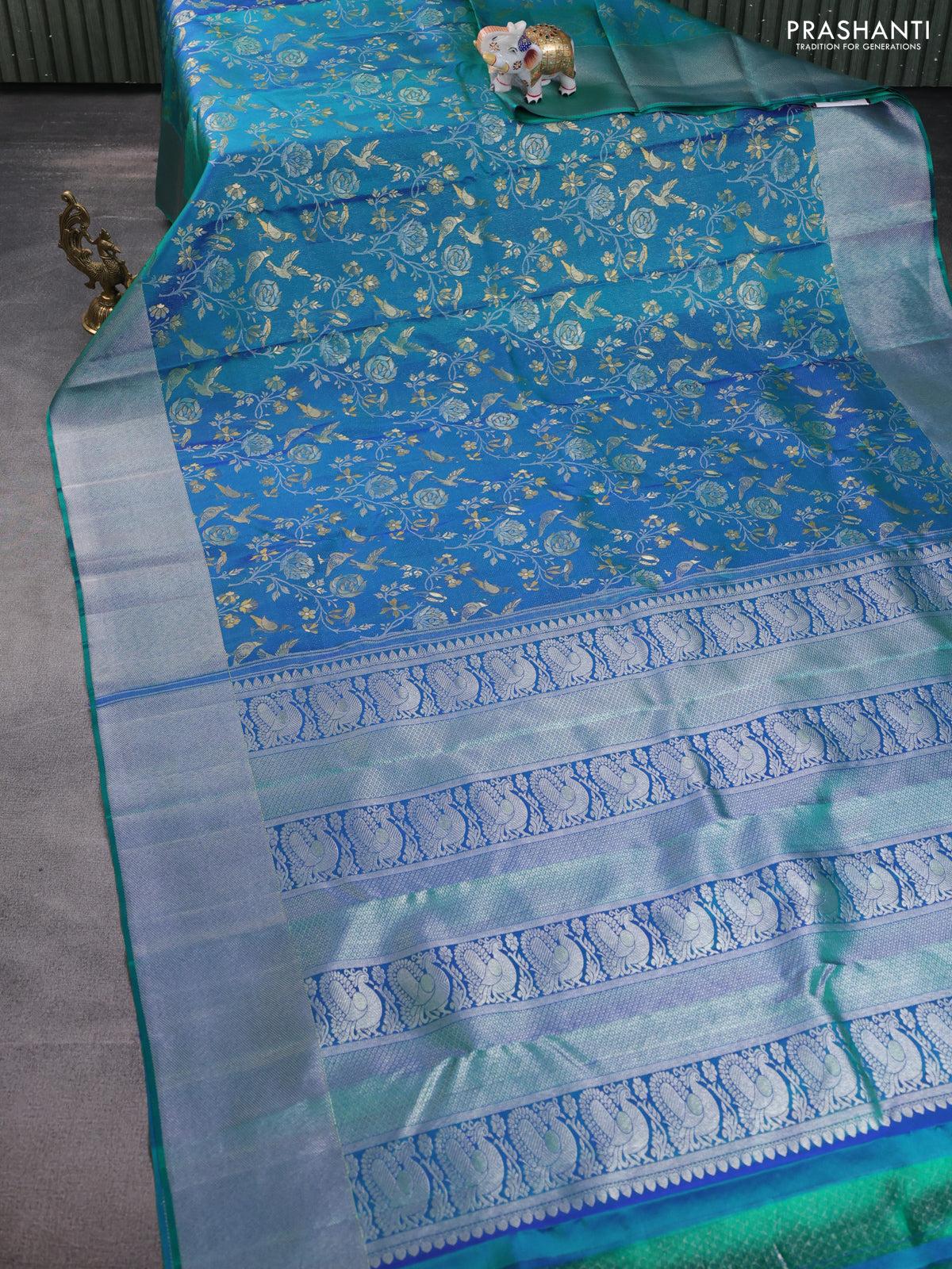 Pure kanchipuram silk saree dual shade of teal green with bird motif weaves and silver zari woven border