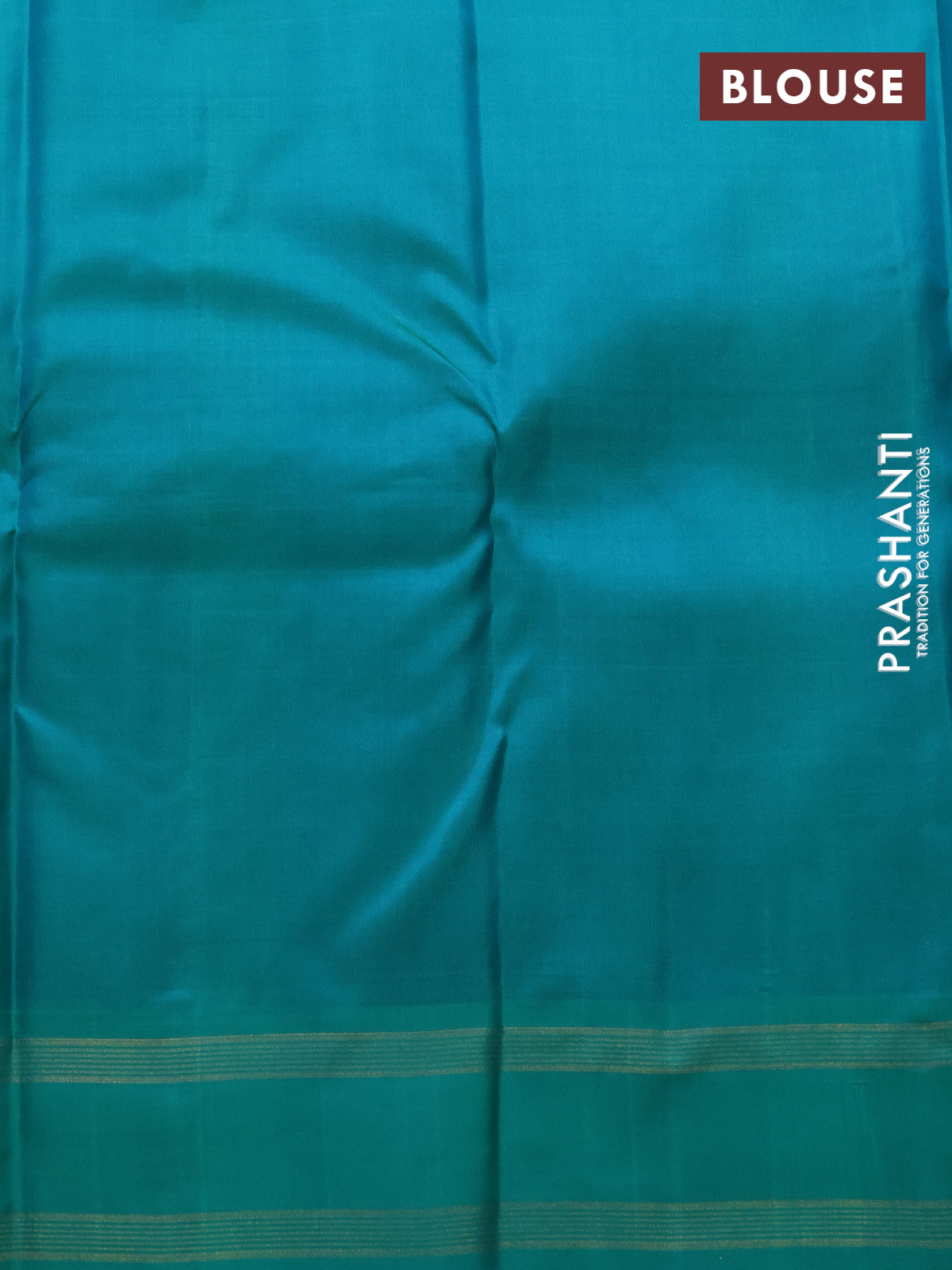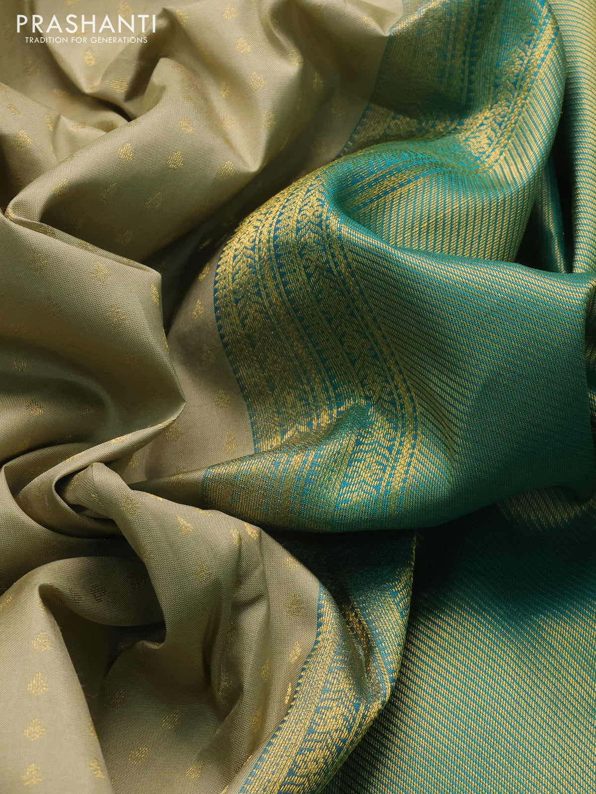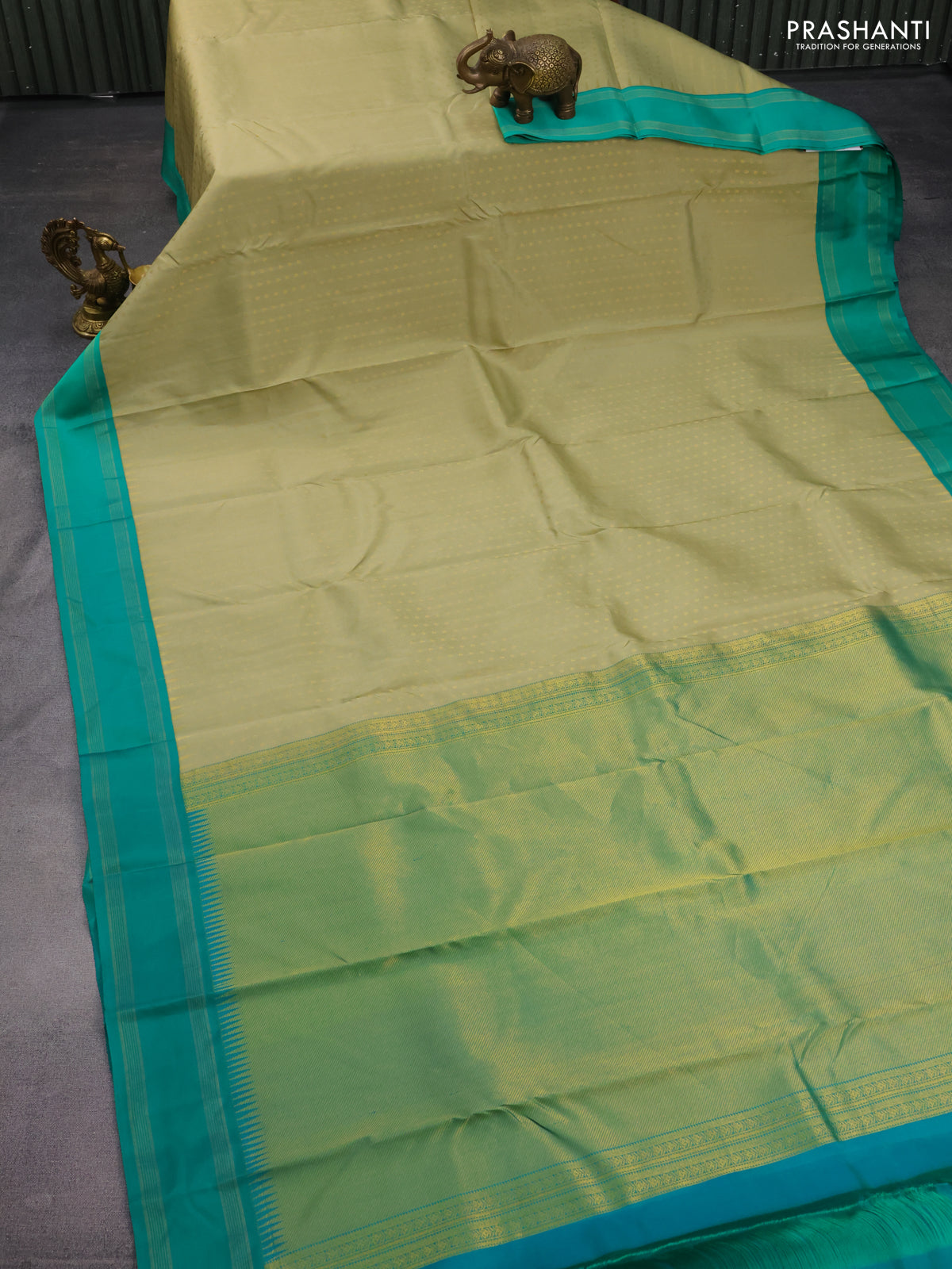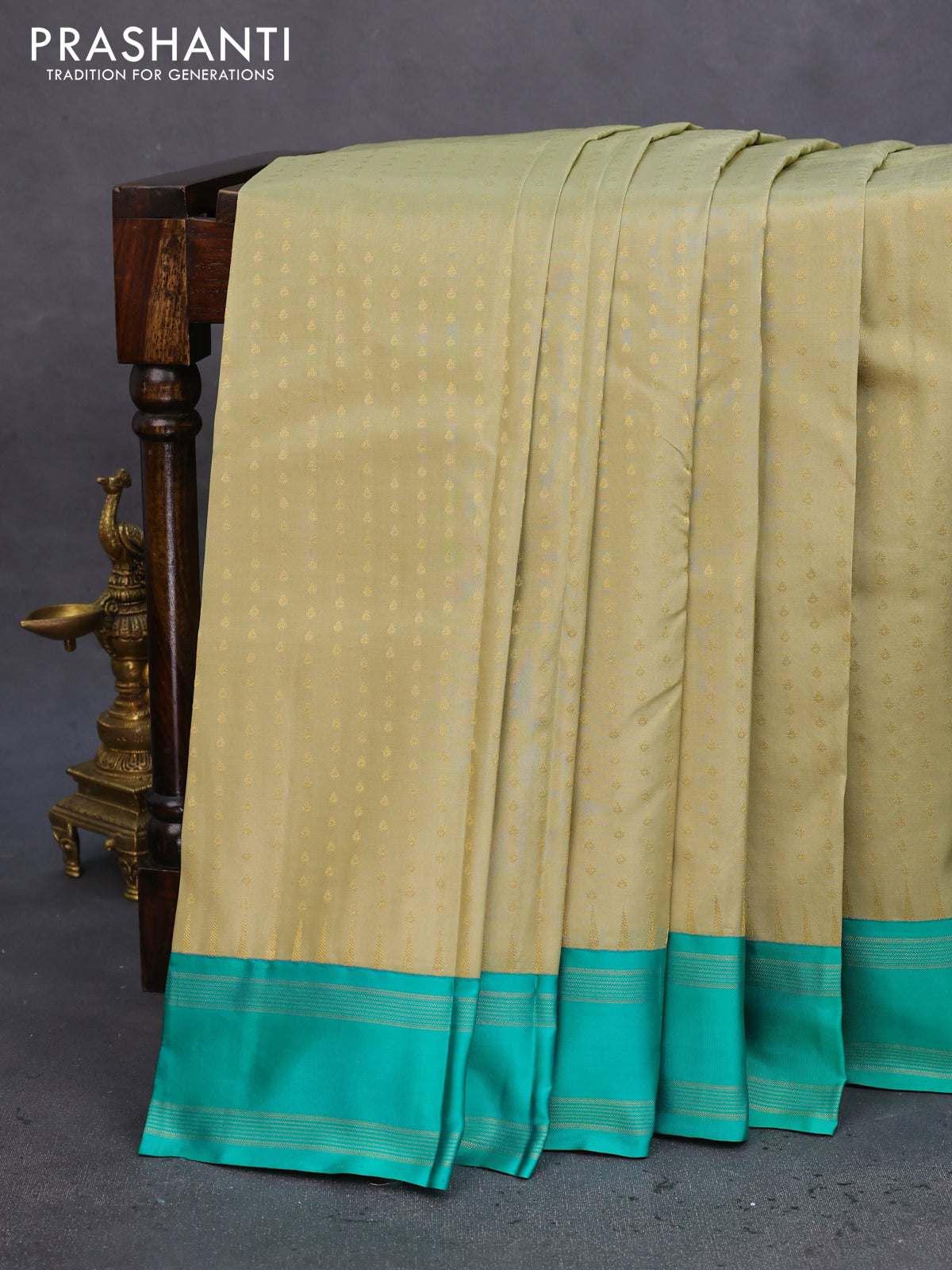 Pure kanchipuram silk saree elaichi green and teal green with allover zari woven 1000 buttas and temple design simple korvai border