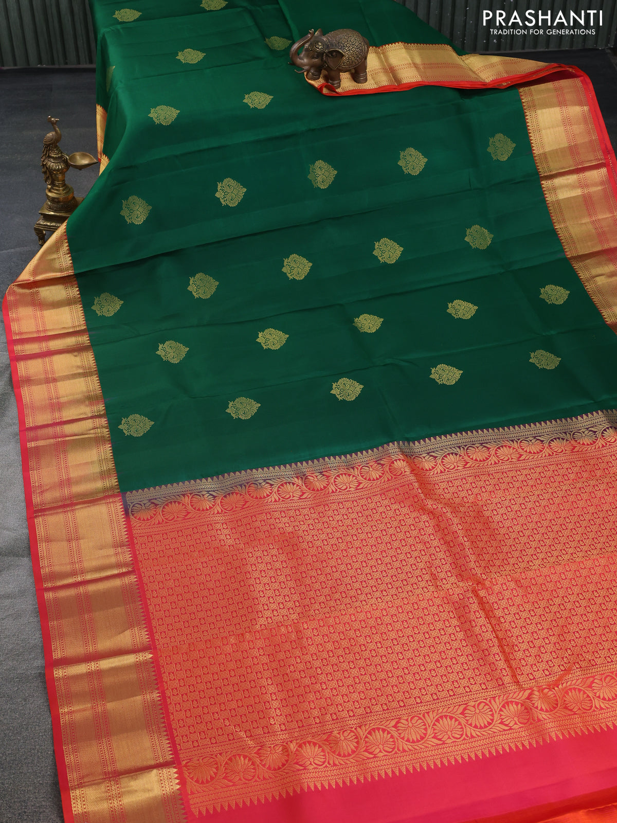 Pure kanchipuram silk saree green and dual shade of pinkish orange with zari woven buttas and zari woven border