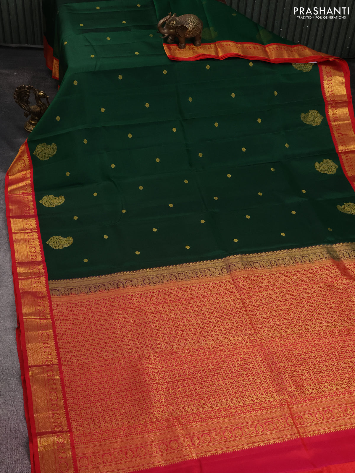 Pure kanchipuram silk saree green and dual shade of pinkish orange with zari woven buttas and zari woven korvai border