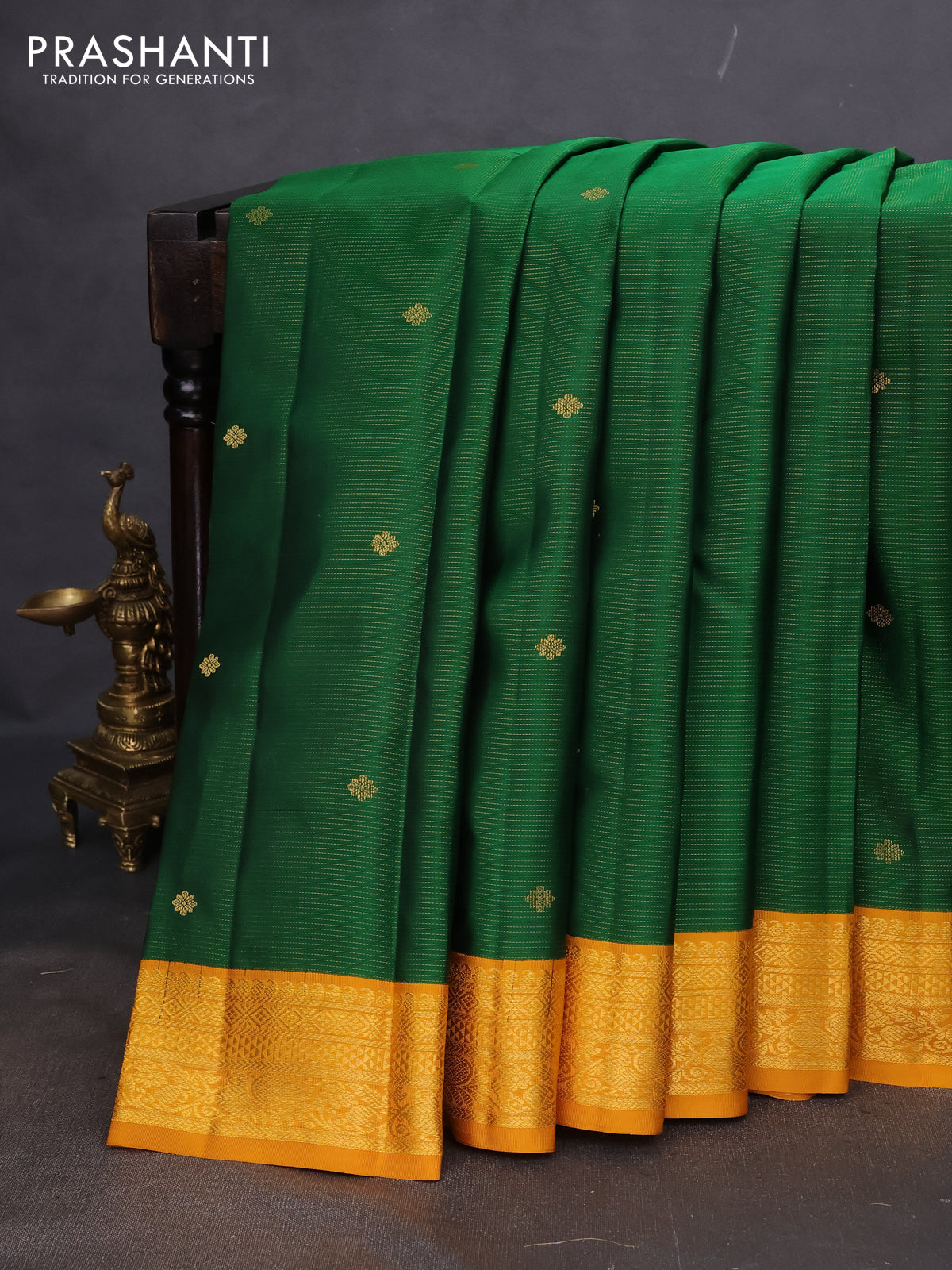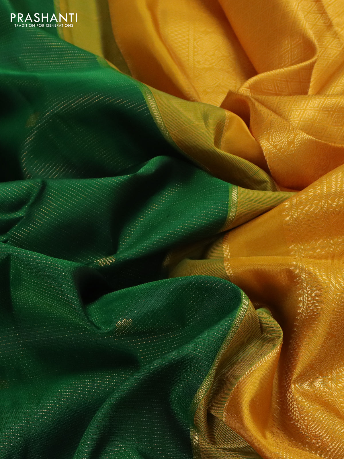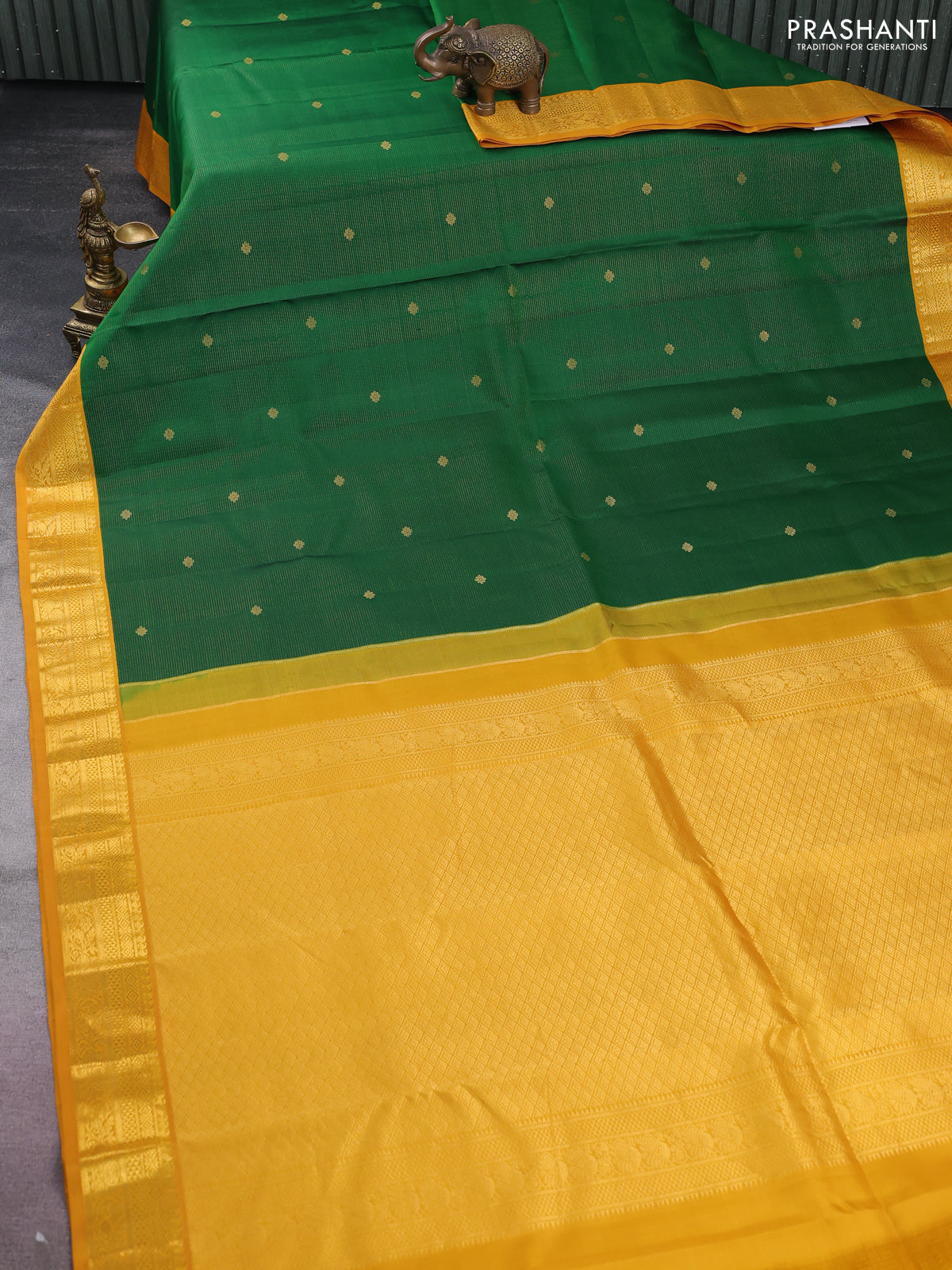 Pure kanchipuram silk saree green and mustard yellow with allover vairosi pattern & annam zari buttas and zari woven korvai border
