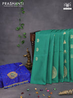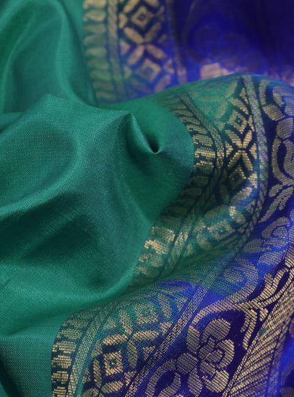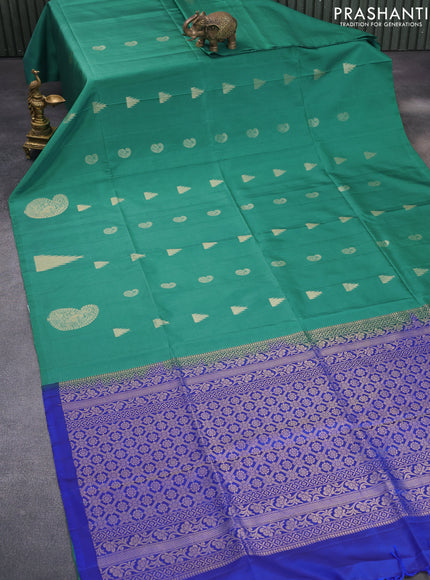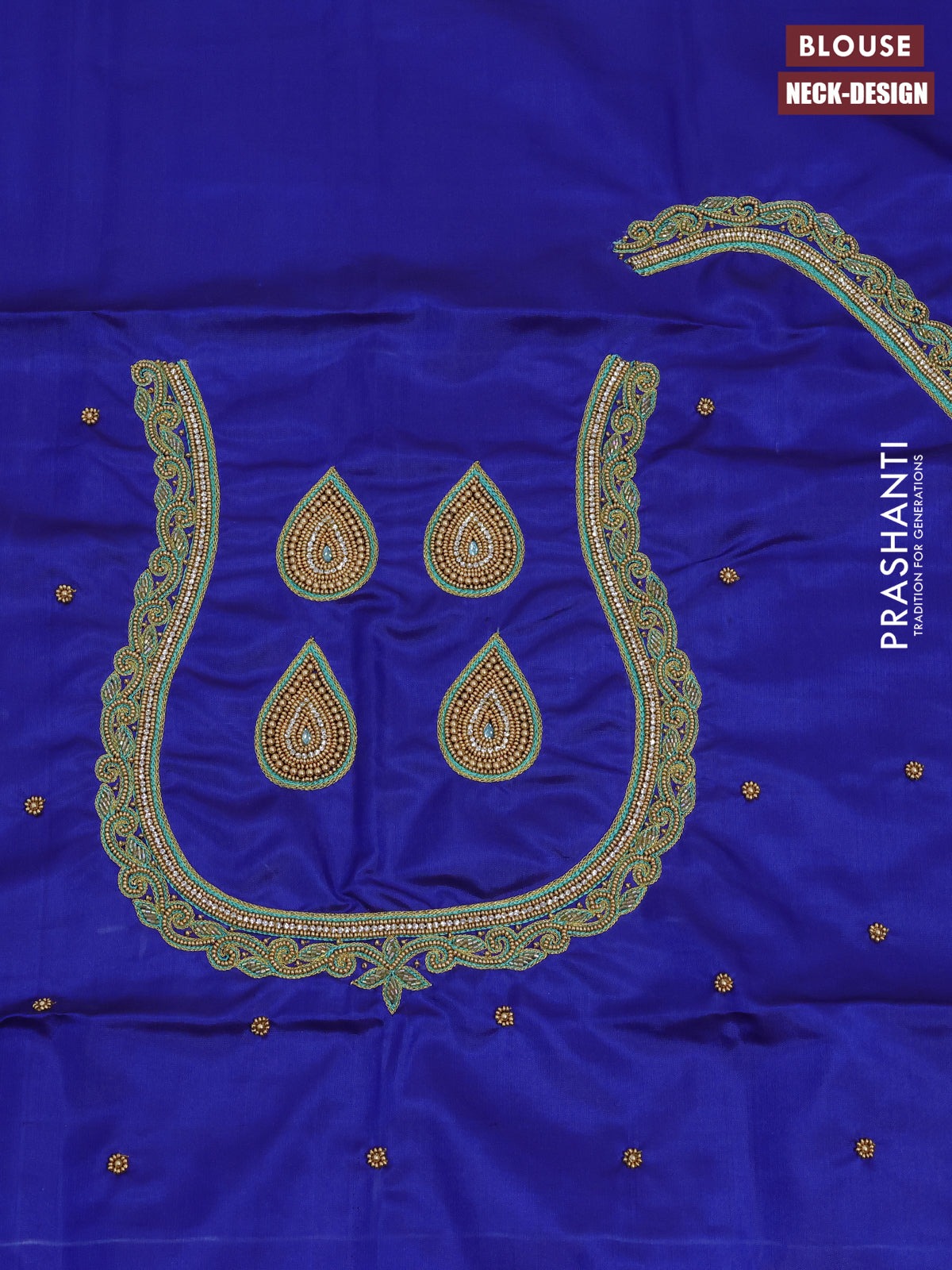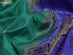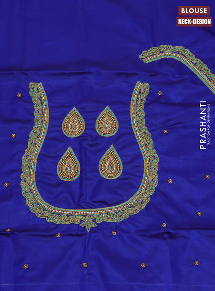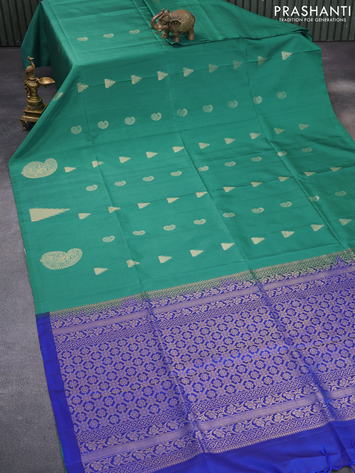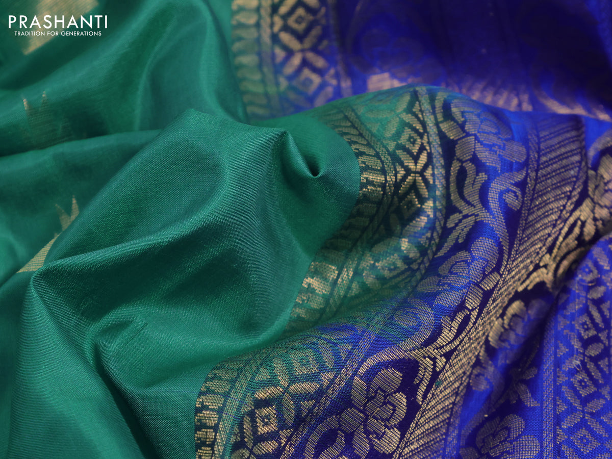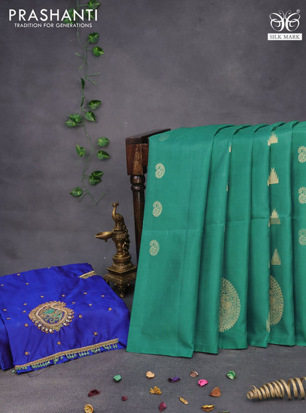 Pure kanchipuram silk saree green and royal blue with paisley & temple zari woven buttas in borderless style & aari work blouse