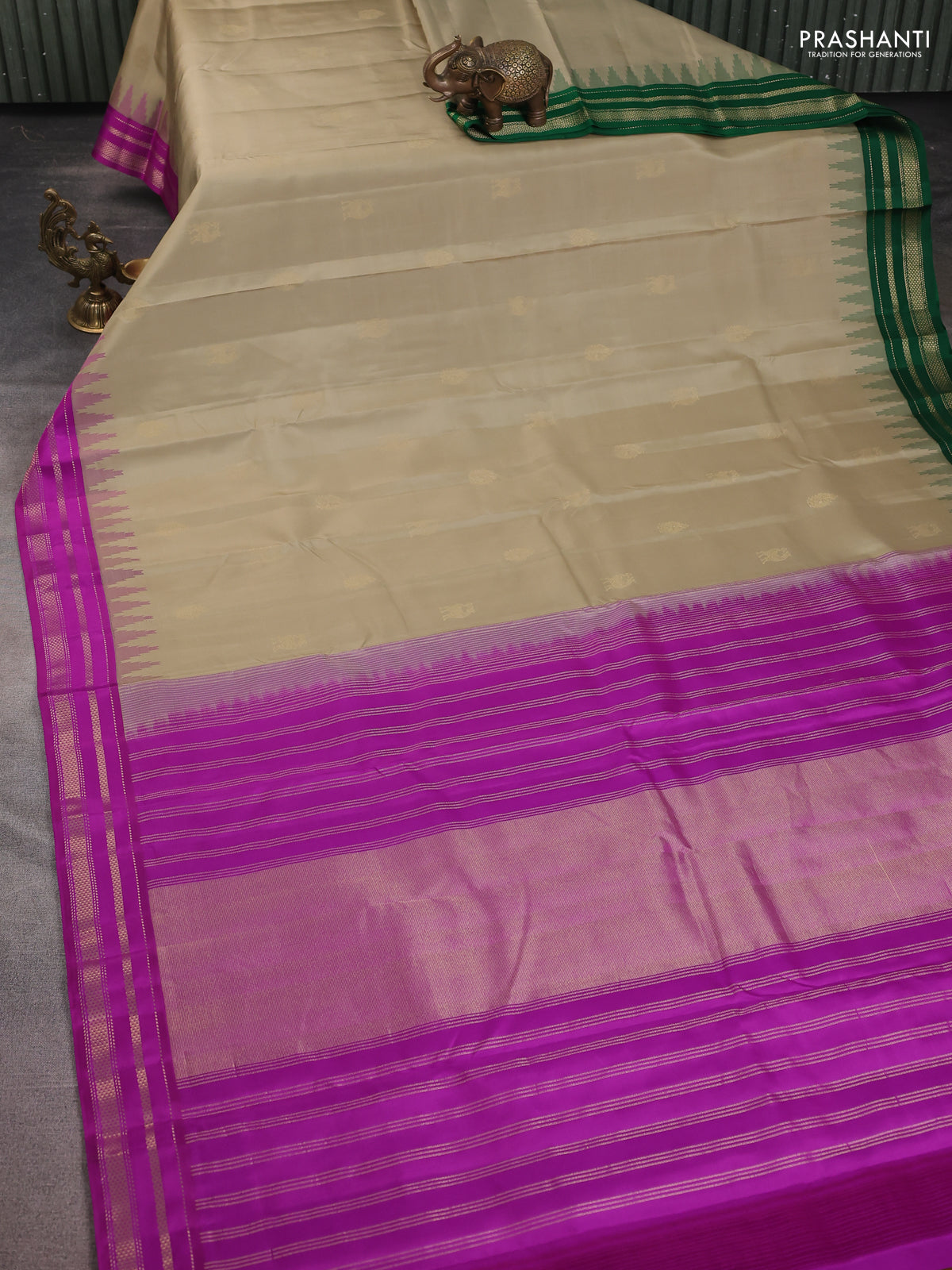 Pure kanchipuram silk saree khaki shade with zari woven buttas and ganga jamuna border