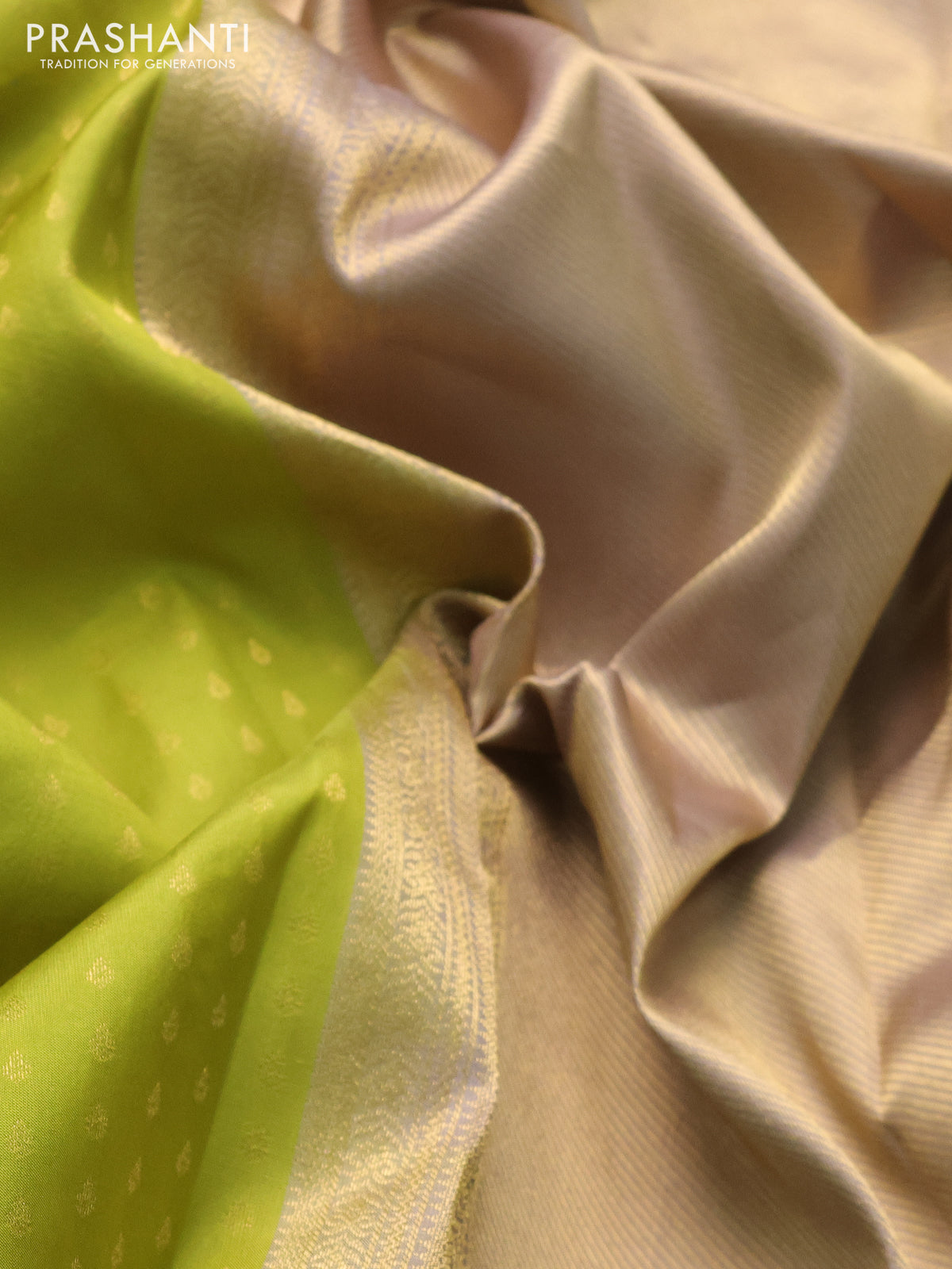Pure kanchipuram silk saree light green and grey shade with allover zari woven 1000 buttas and temple design simple korvai border