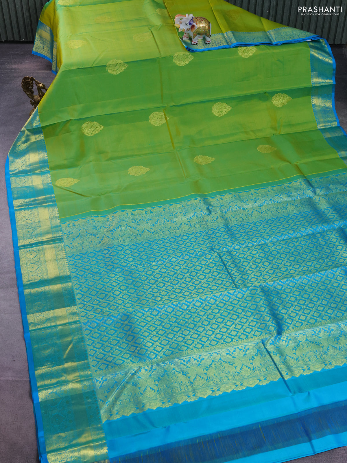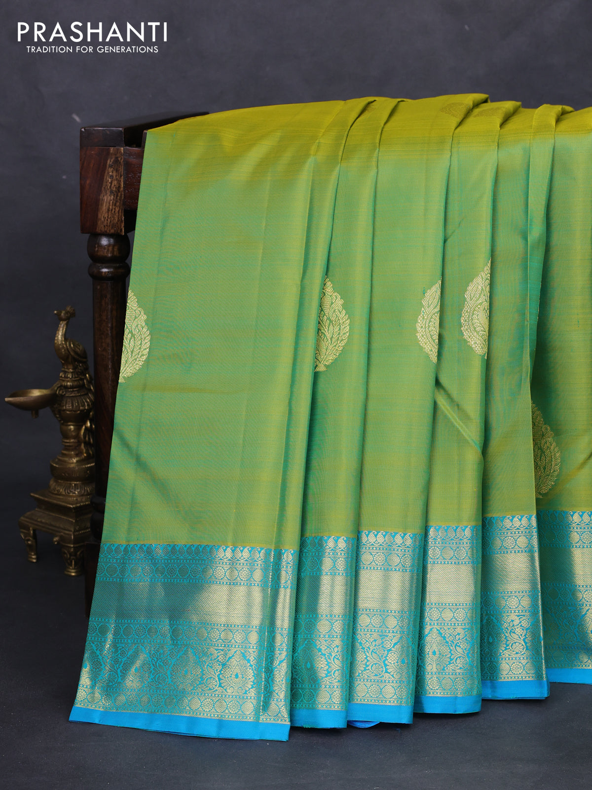 Pure kanchipuram silk saree light green and teal blue with zari woven buttas and zari woven border