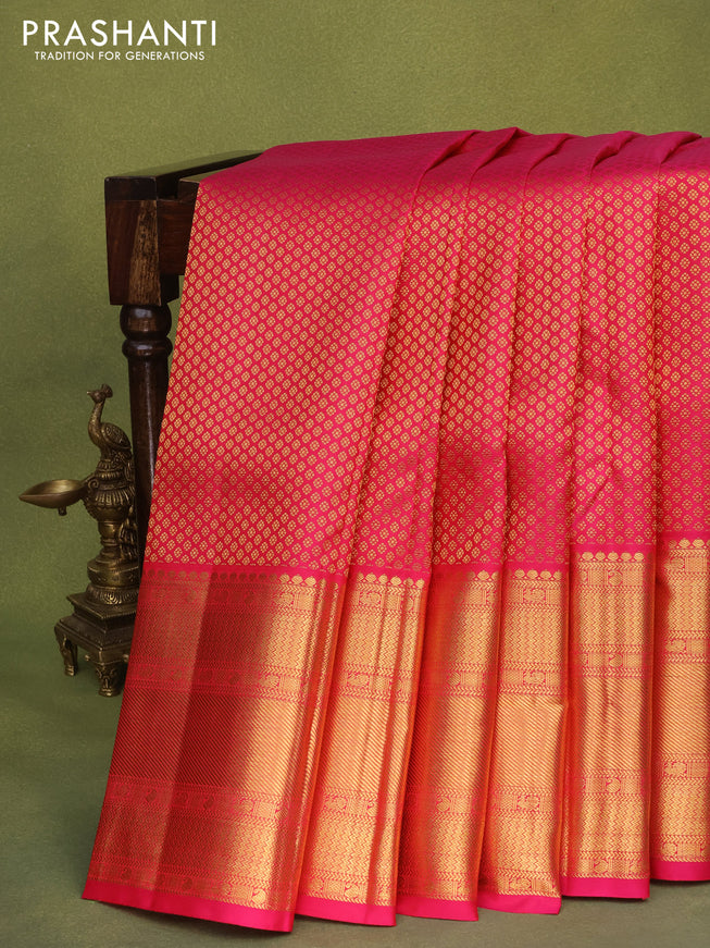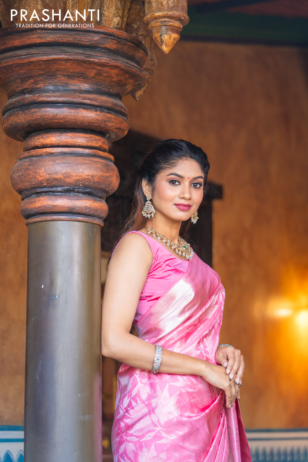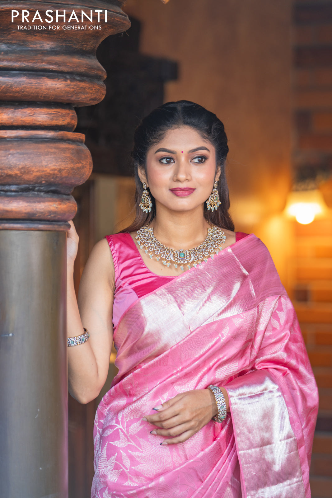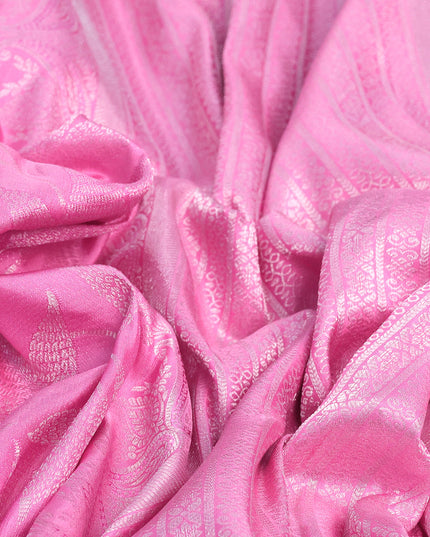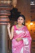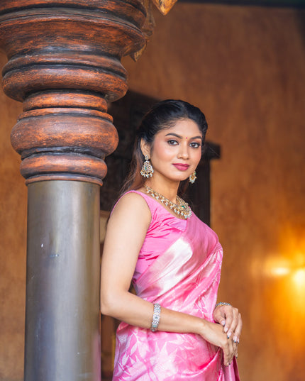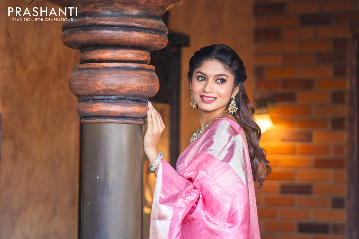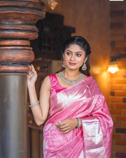 Pure kanchipuram silk saree light pink with allover silver zari woven brocade weaves and silver zari woven border