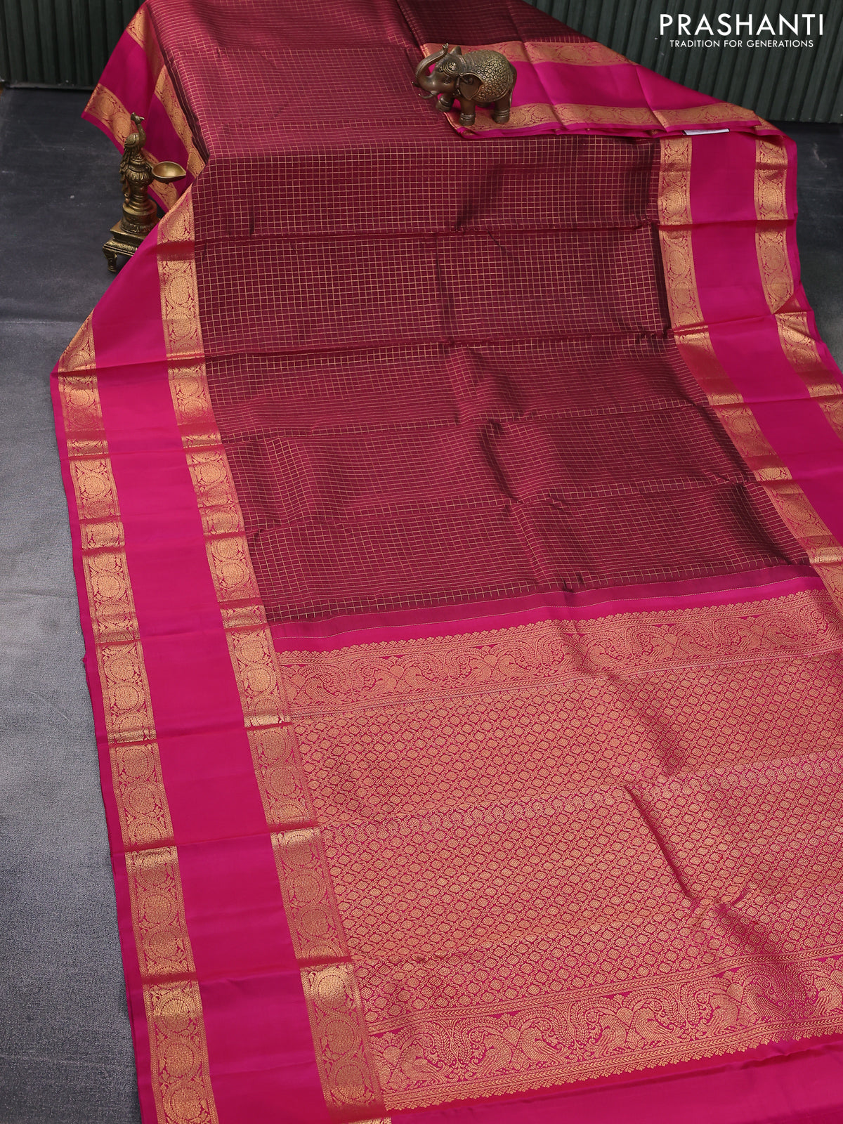 Pure kanchipuram silk saree maroon and pink with allover zari checked pattern and long rettapet zari woven border