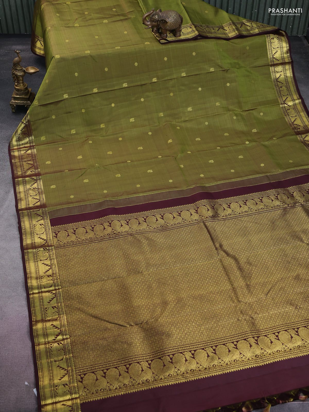 Pure kanchipuram silk saree mehendi green and maroon with zari woven buttas and annam zari woven border