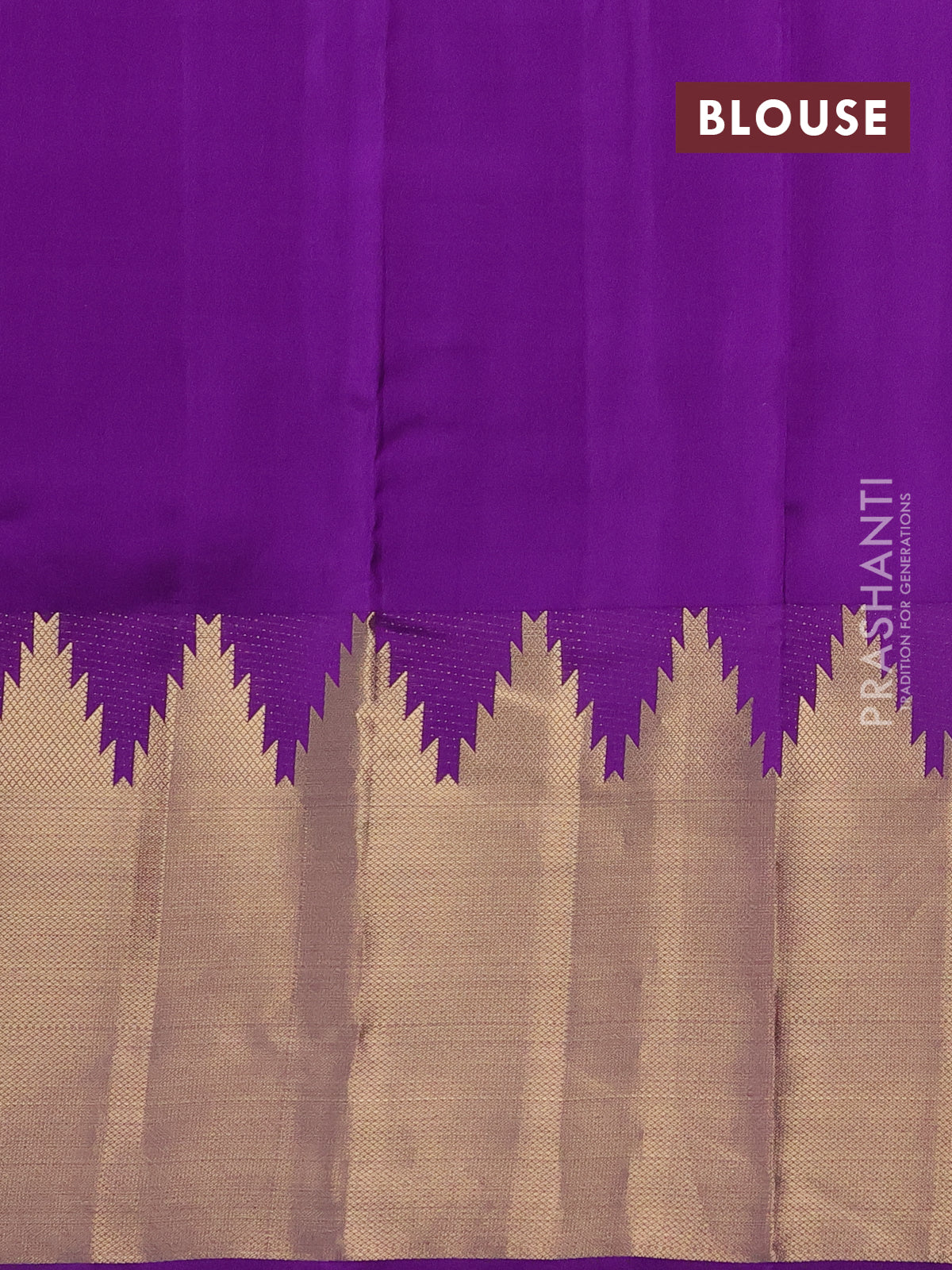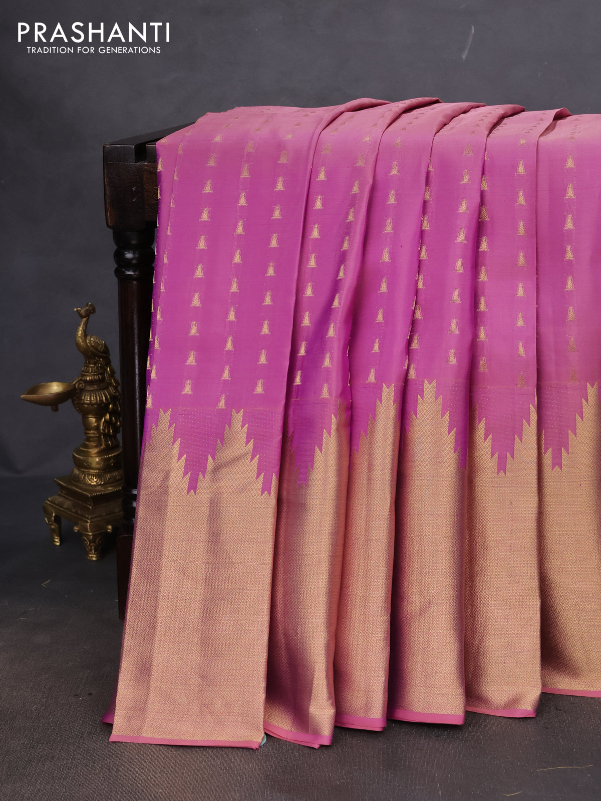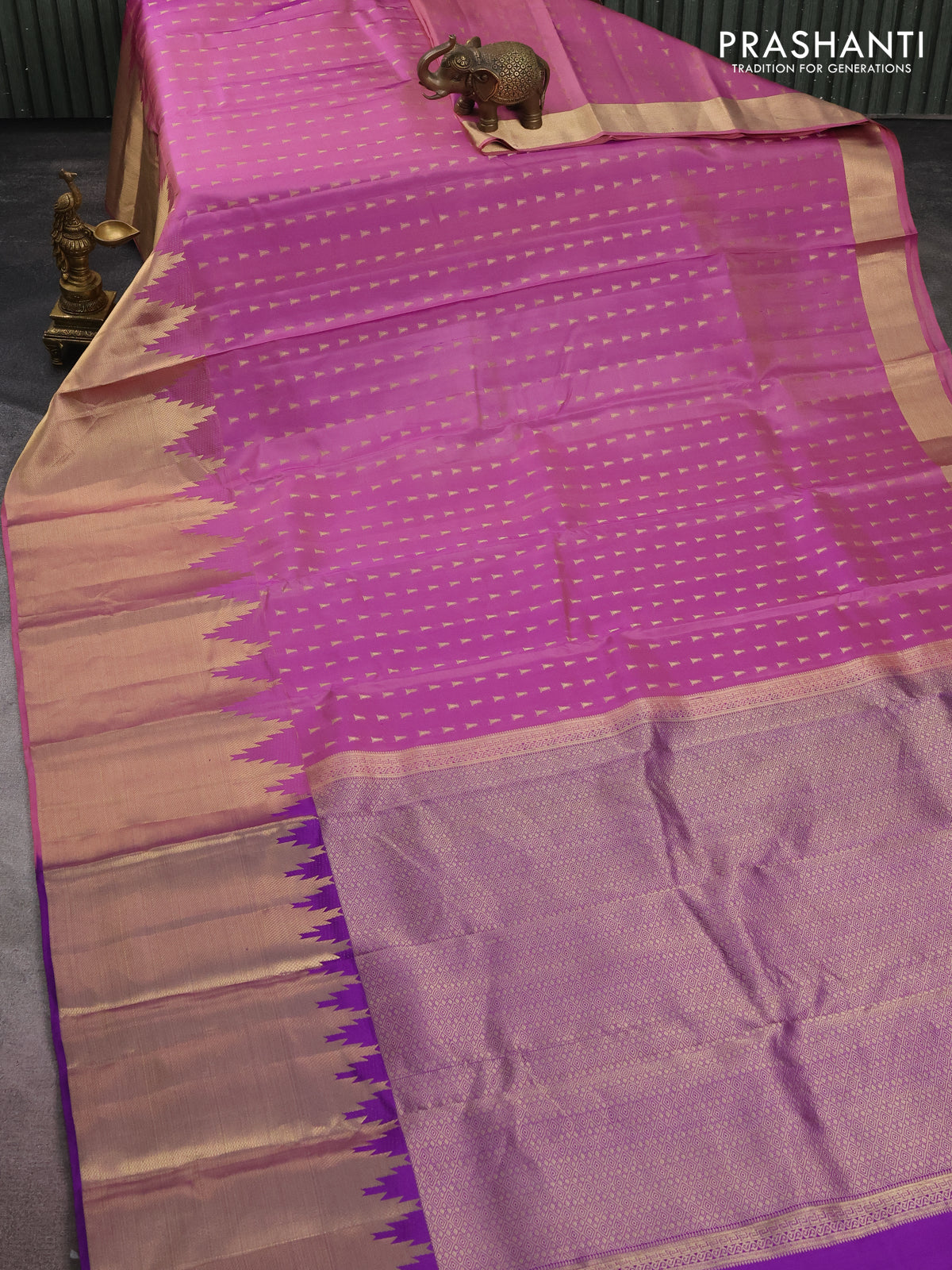 Pure kanchipuram silk saree mild lavender and violet with allover zari woven temple buttas and long temple zari woven border