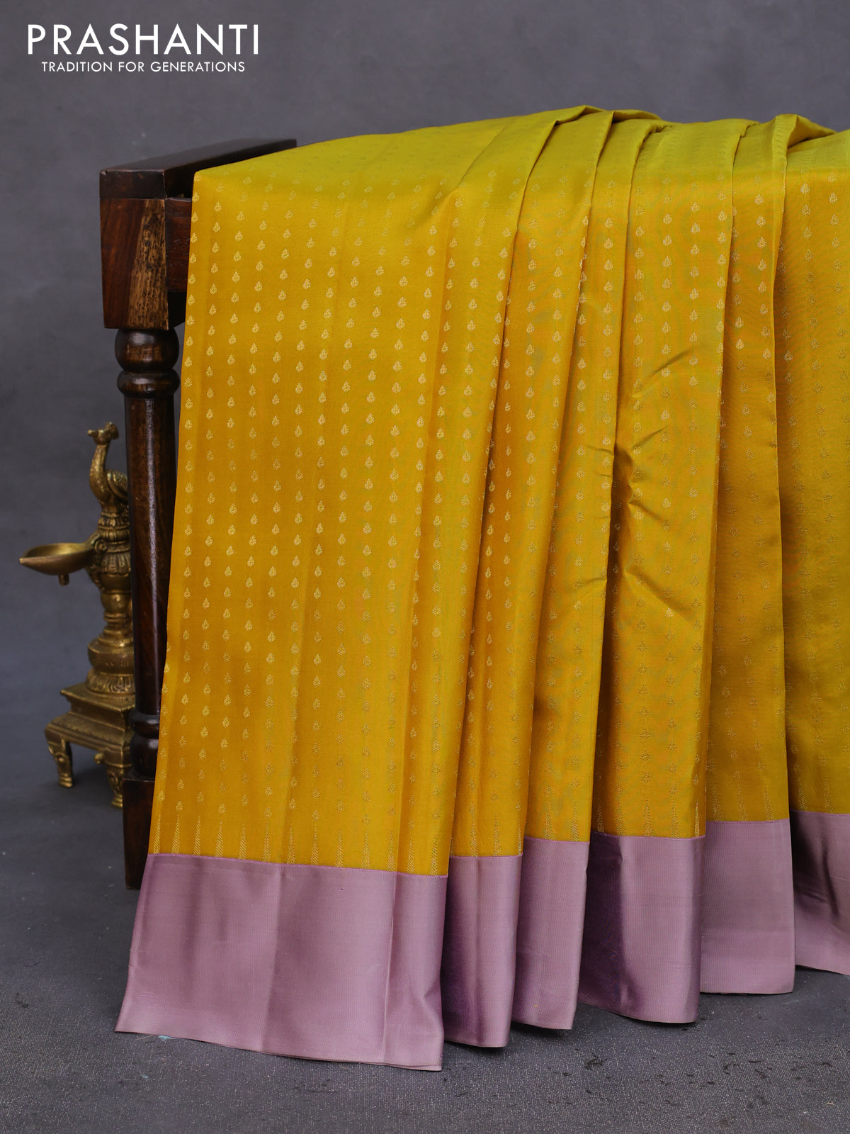 Pure kanchipuram silk saree mustard yellow and grey shade with allover zari woven 1000 buttas and temple design simple korvai border