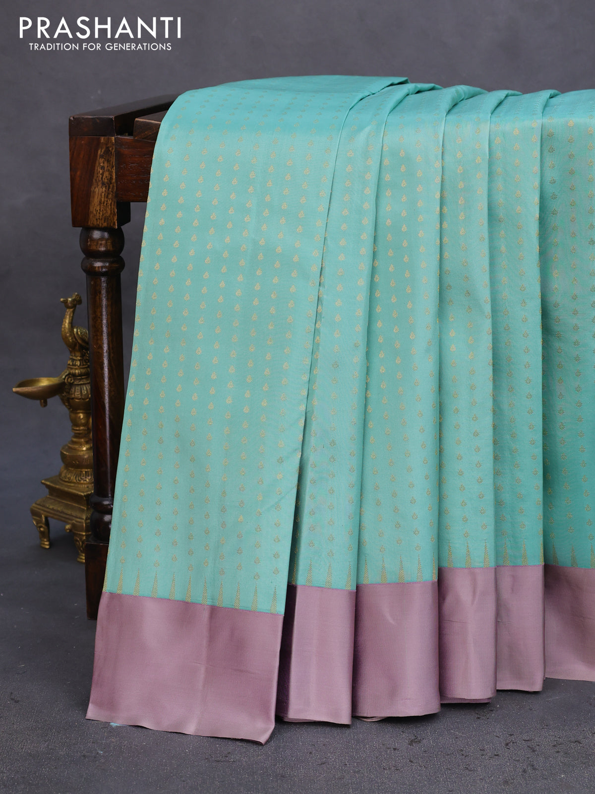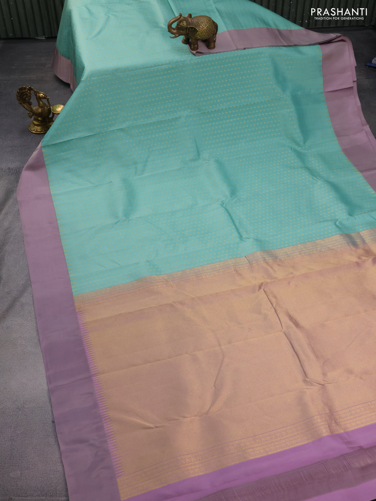 Pure kanchipuram silk saree pastel blue and grey shade with allover zari woven 1000 buttas and temple design simple korvai border
