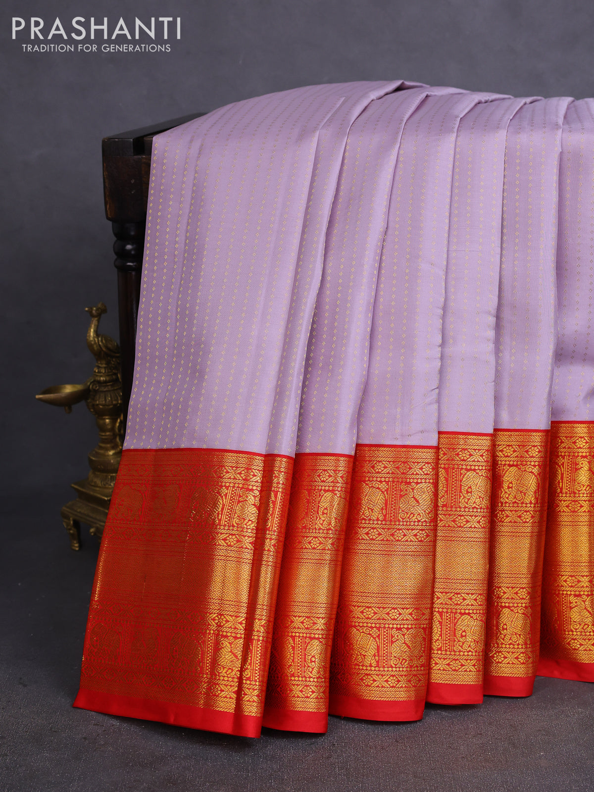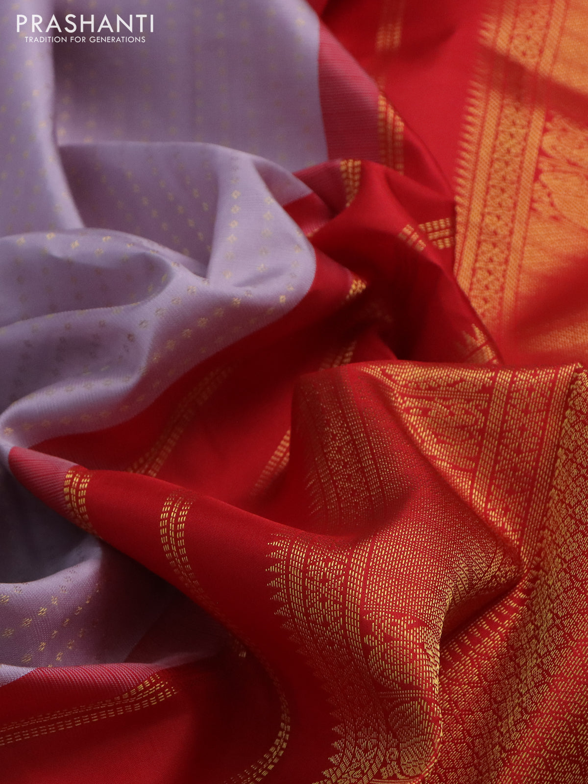 Pure kanchipuram silk saree pastel lavender and red with allover zari woven 1000 butta weaves and long zari woven korvai border