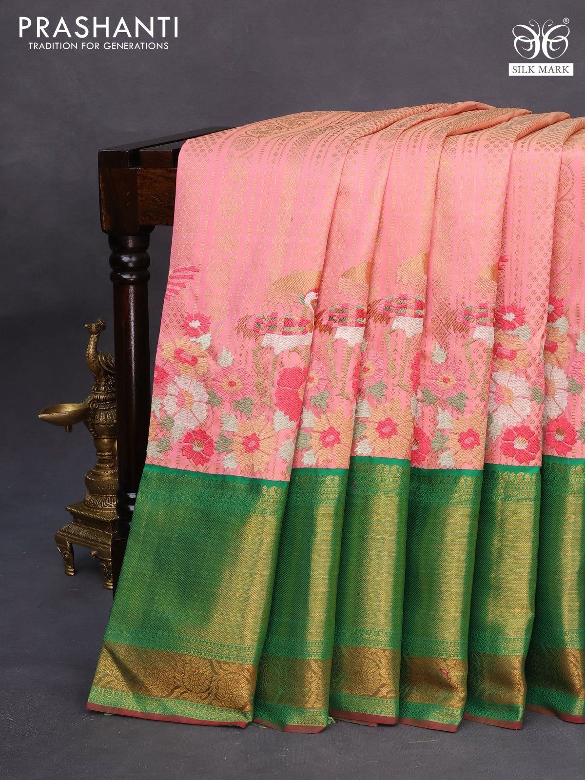 Pure kanchipuram silk saree peach pink and green with allover zari weaves and embroidery work long zari border