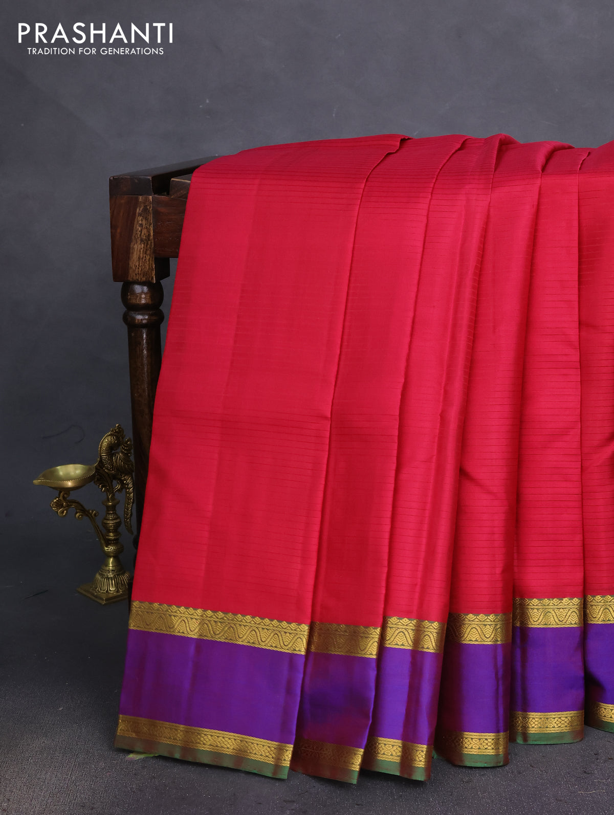 Pure kanchipuram silk saree red and dual shade of violet with allover stripe pattern and rettapet zari woven border