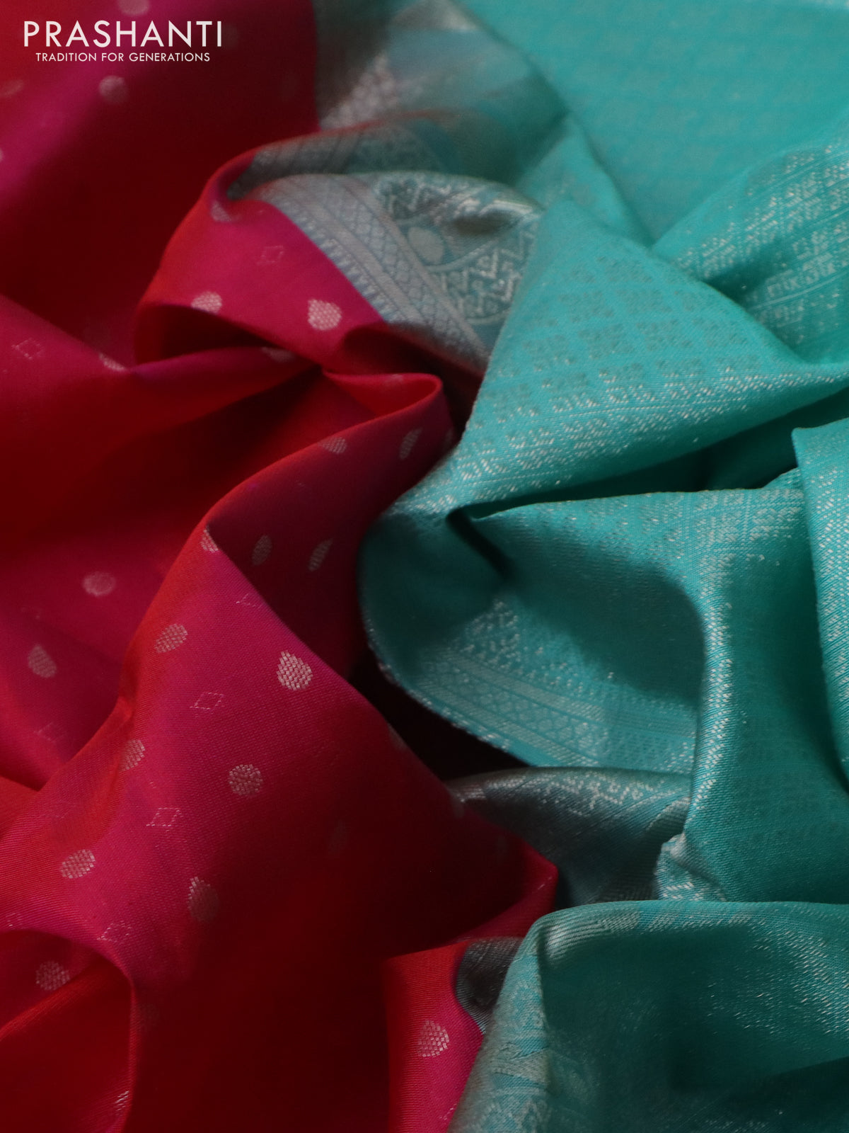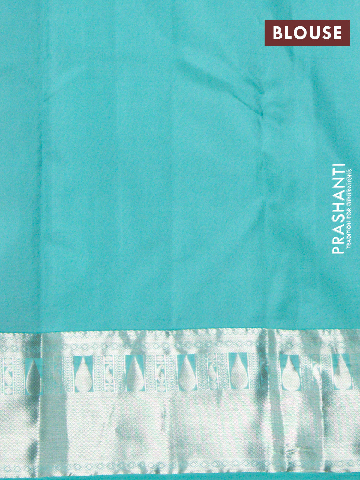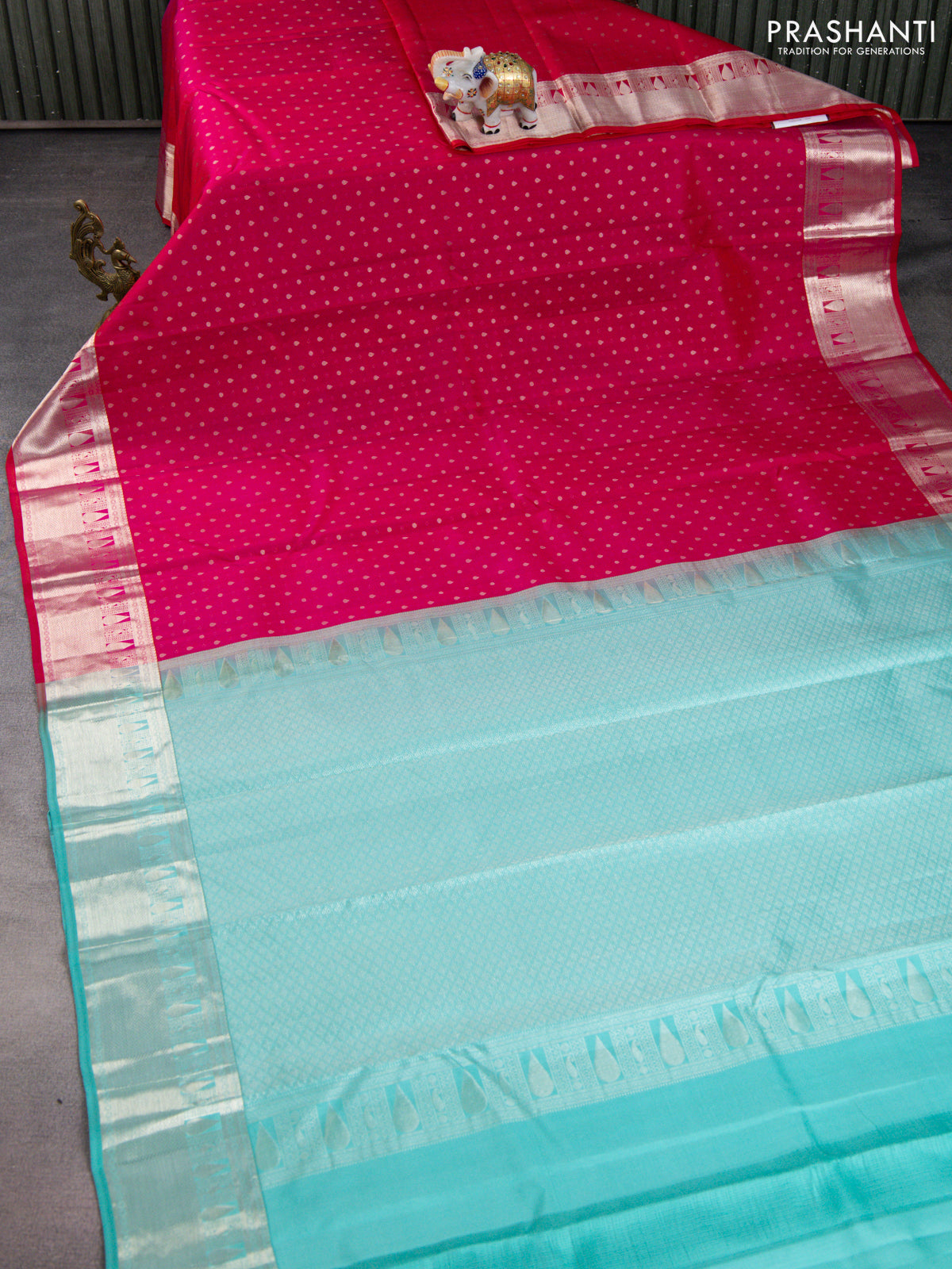 Pure kanchipuram silk saree pink and teal blue with allover silver zari woven 1000 butta weaves and rich zari woven border