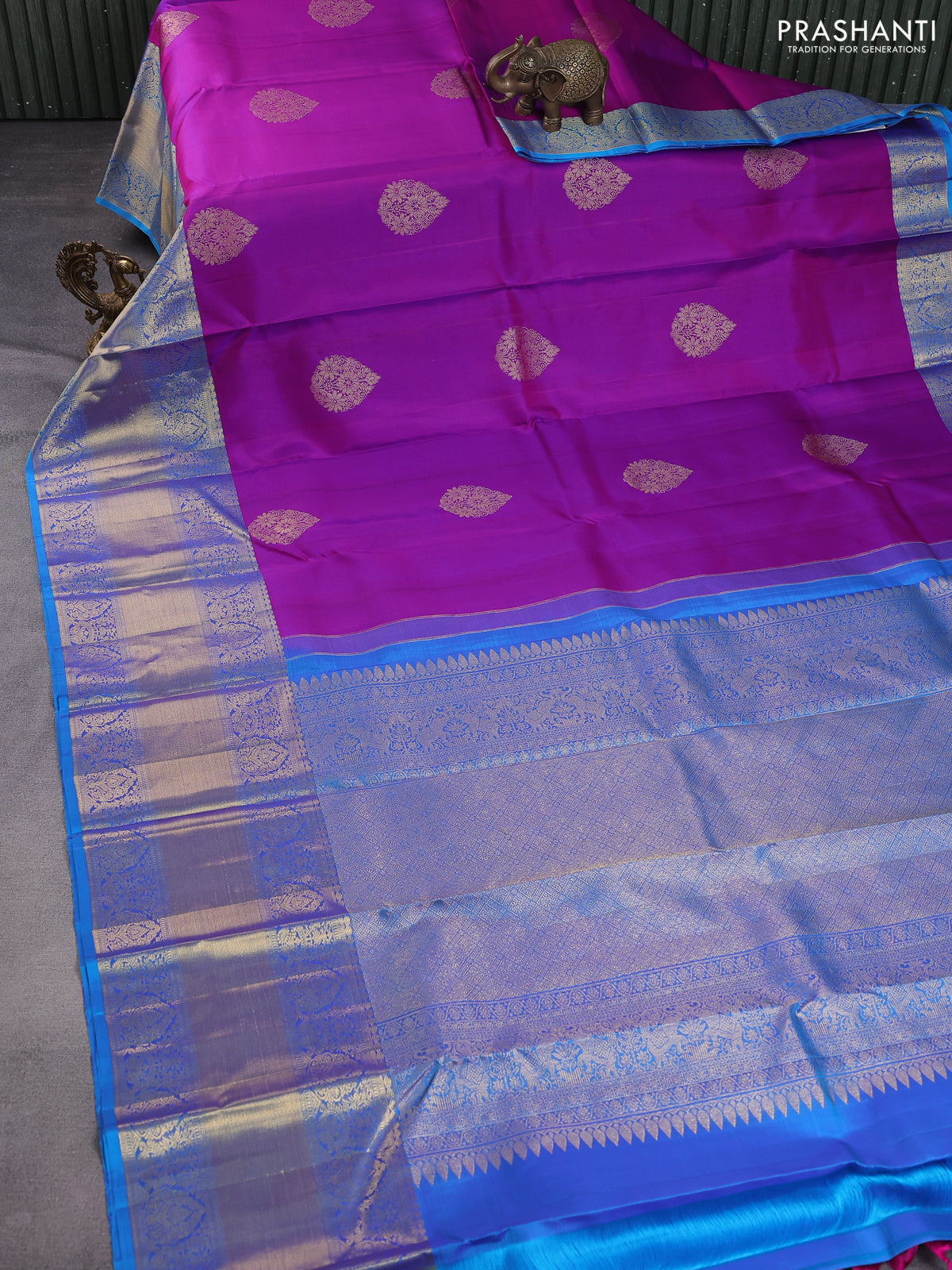 Pure kanchipuram silk saree purple and dual shade of cs blue with zari woven buttas and long rich zari woven border