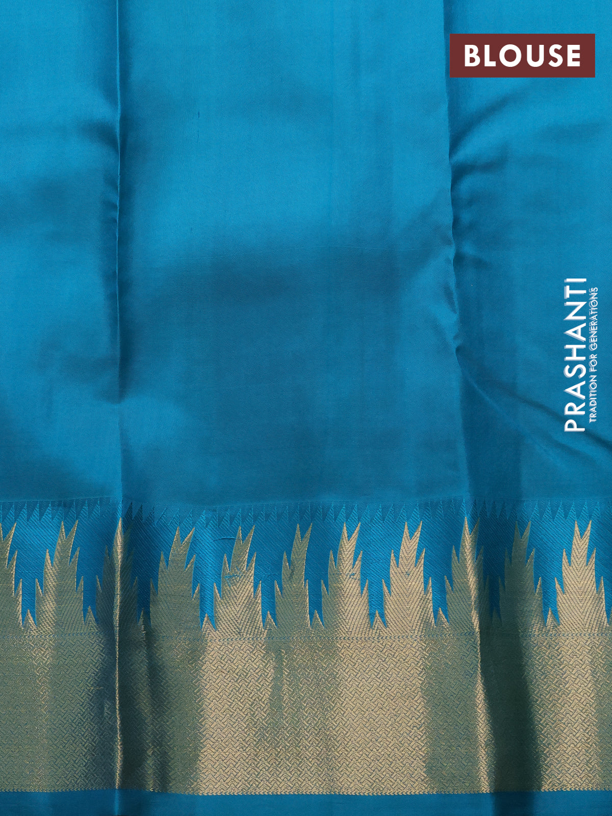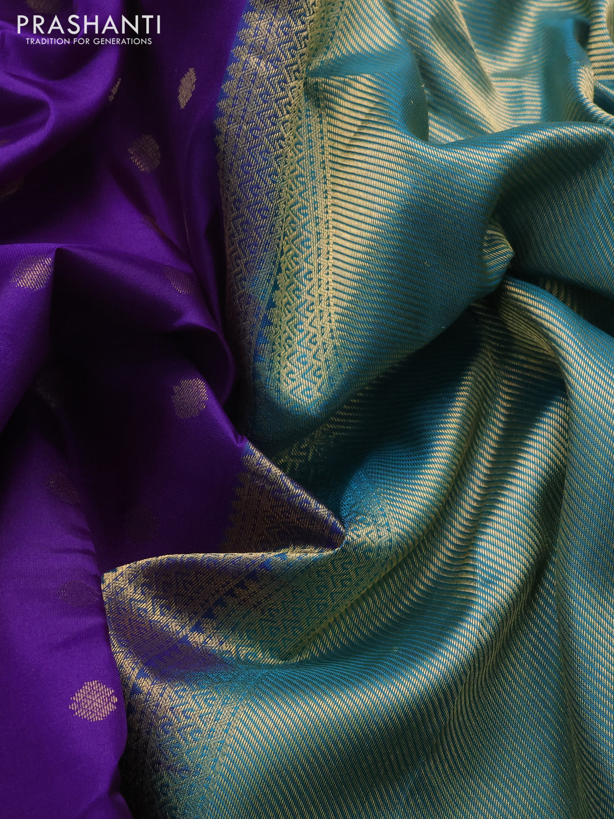 Pure kanchipuram silk saree purple and teal green with allover zari woven buttas and temple design zari woven border