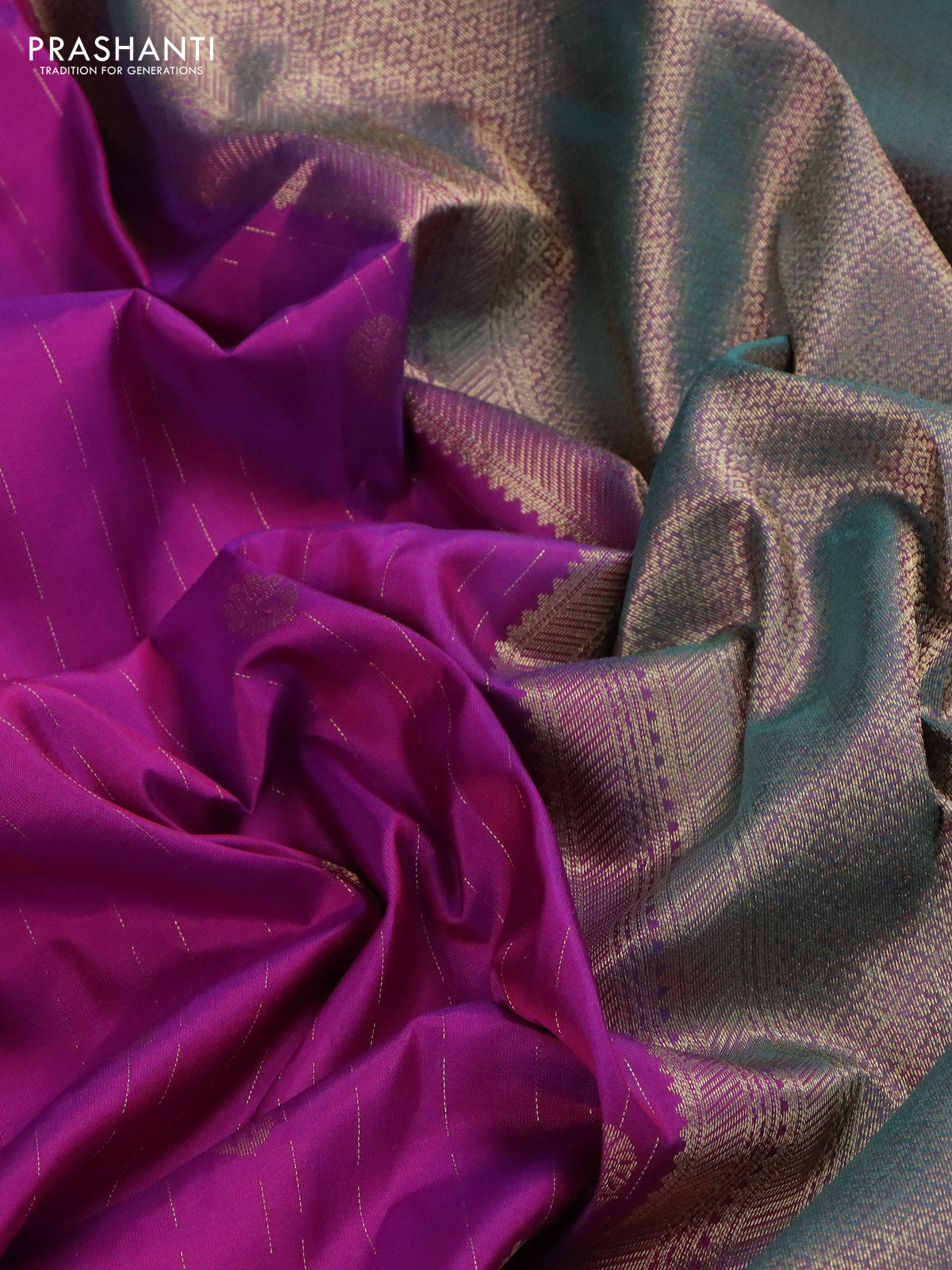 Pure kanchipuram silk saree purple shade and dual shade of teal green with allover zari weaves and rich zari woven border