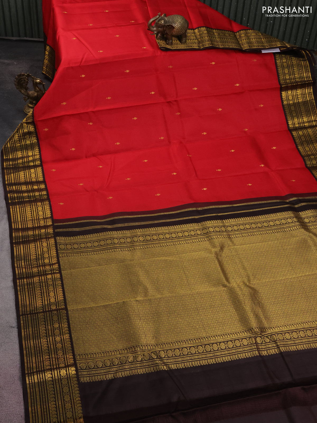 Pure kanchipuram silk saree red and brown with zari woven buttas and zari woven korvai border