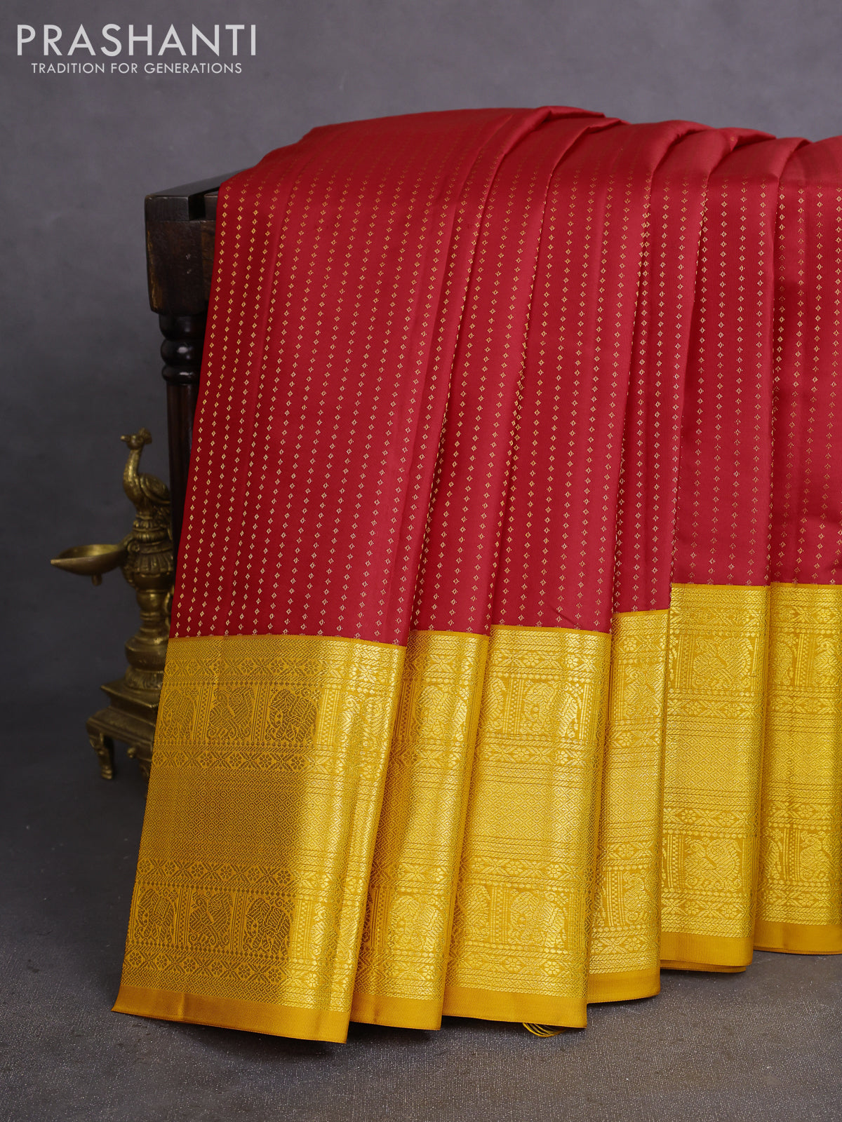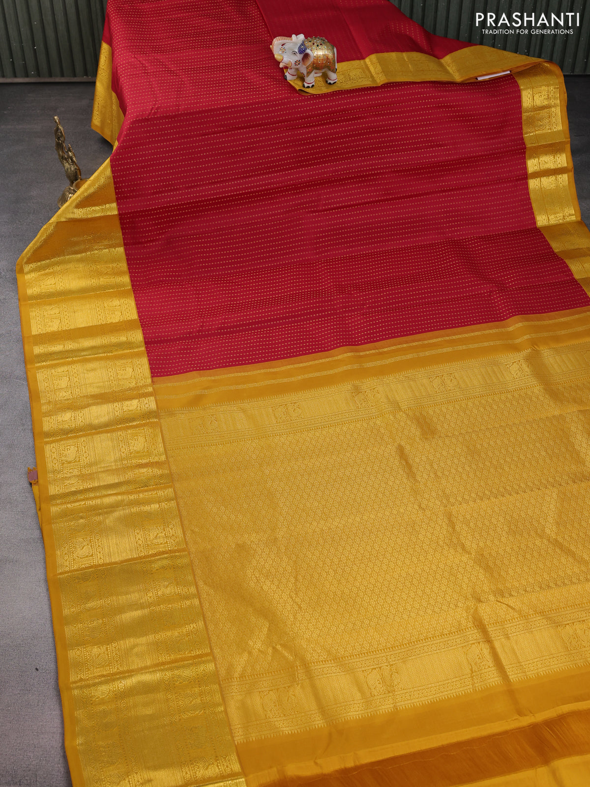 Pure kanchipuram silk saree red and mustard yellow with allover zari woven 1000 butta weaves and long zari woven korvai border