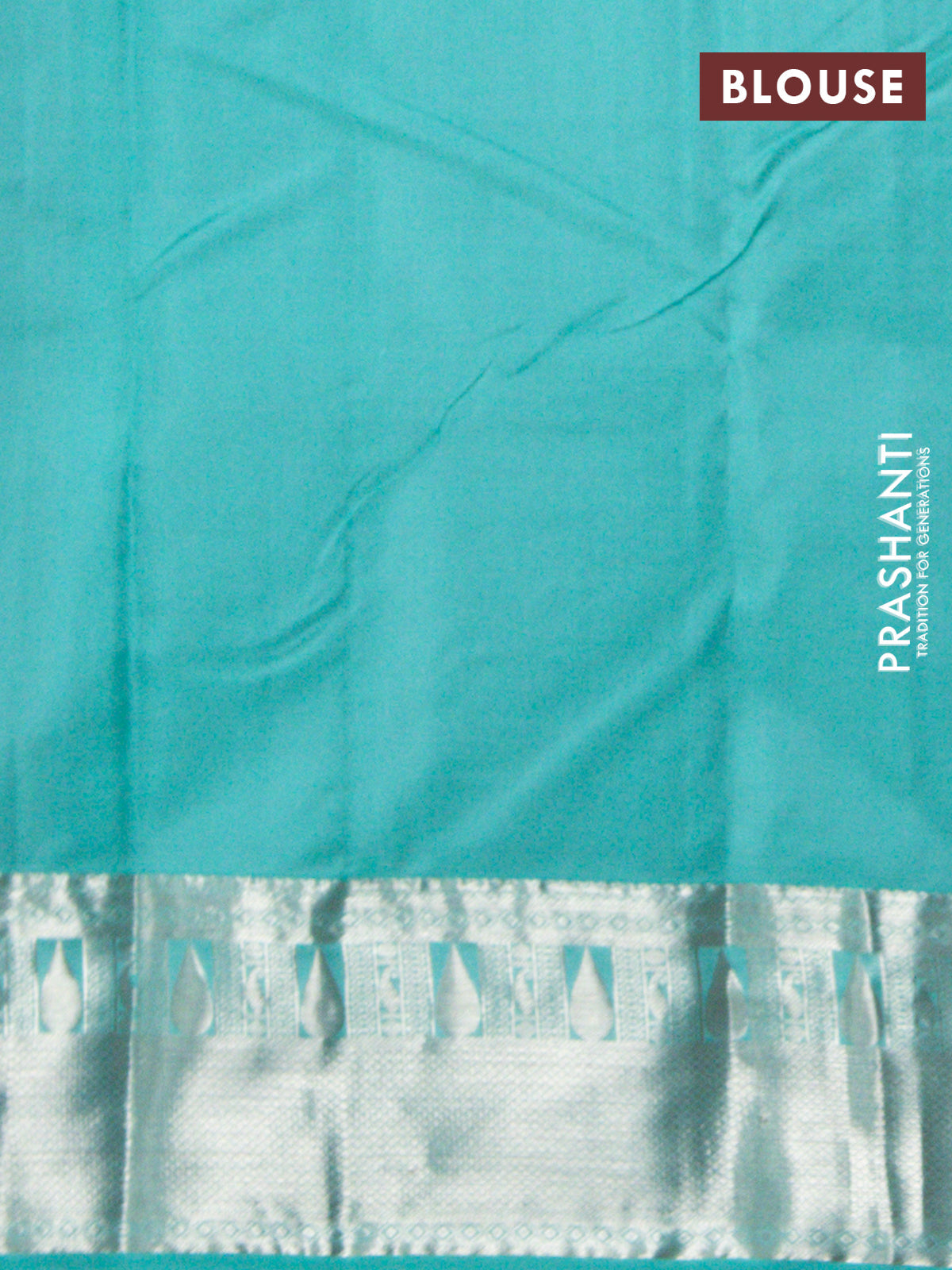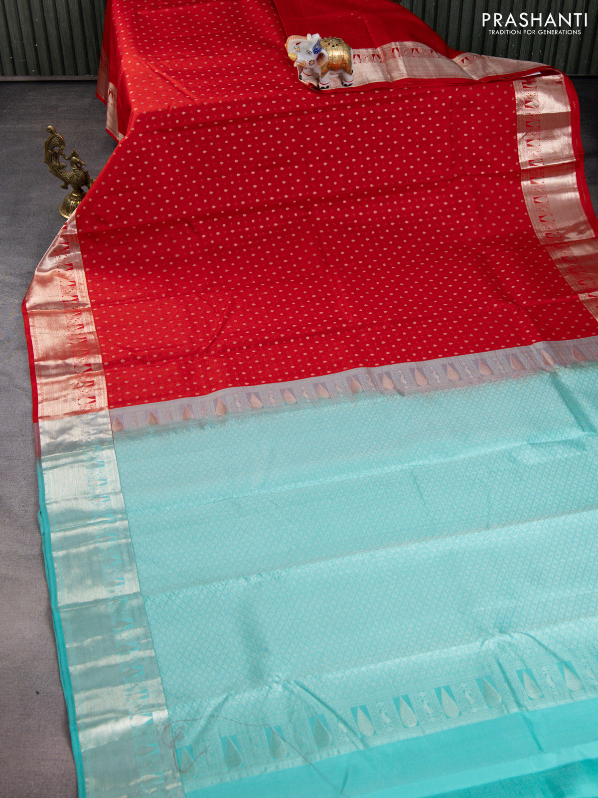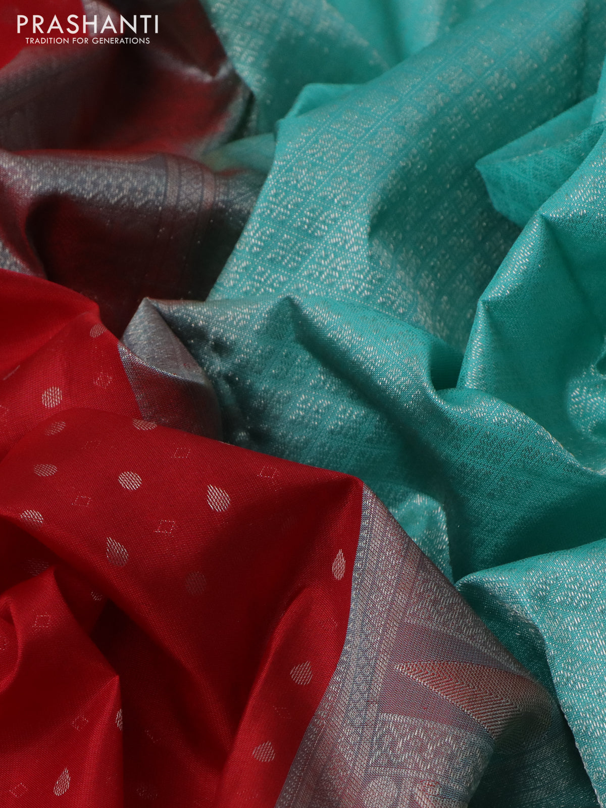 Pure kanchipuram silk saree red and teal blue with allover silver zari woven 1000 butta weaves and rich zari woven border