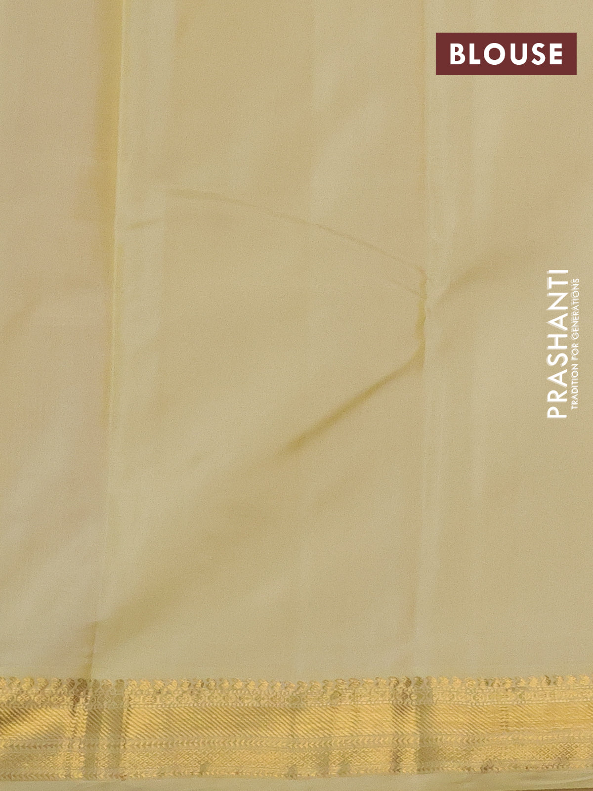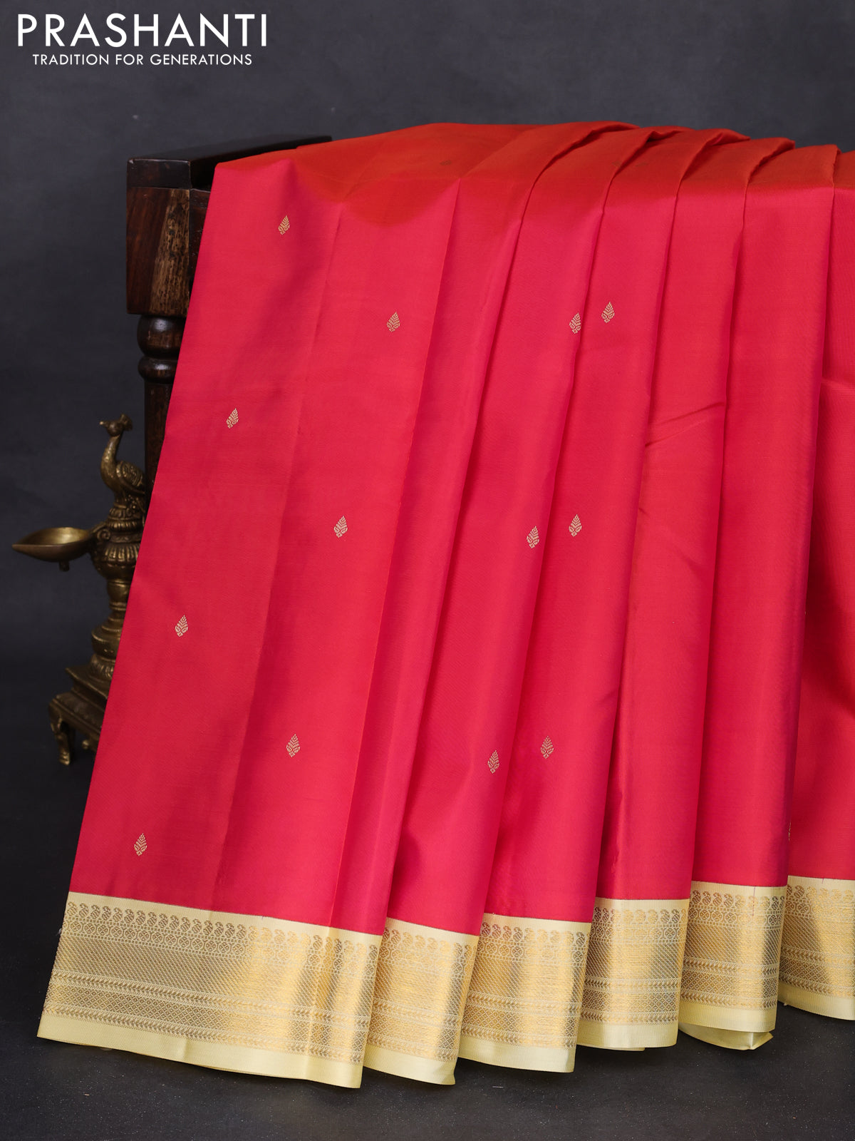 Pure kanchipuram silk saree reddish pink and pale yellow with zari woven buttas and zari woven korvai border