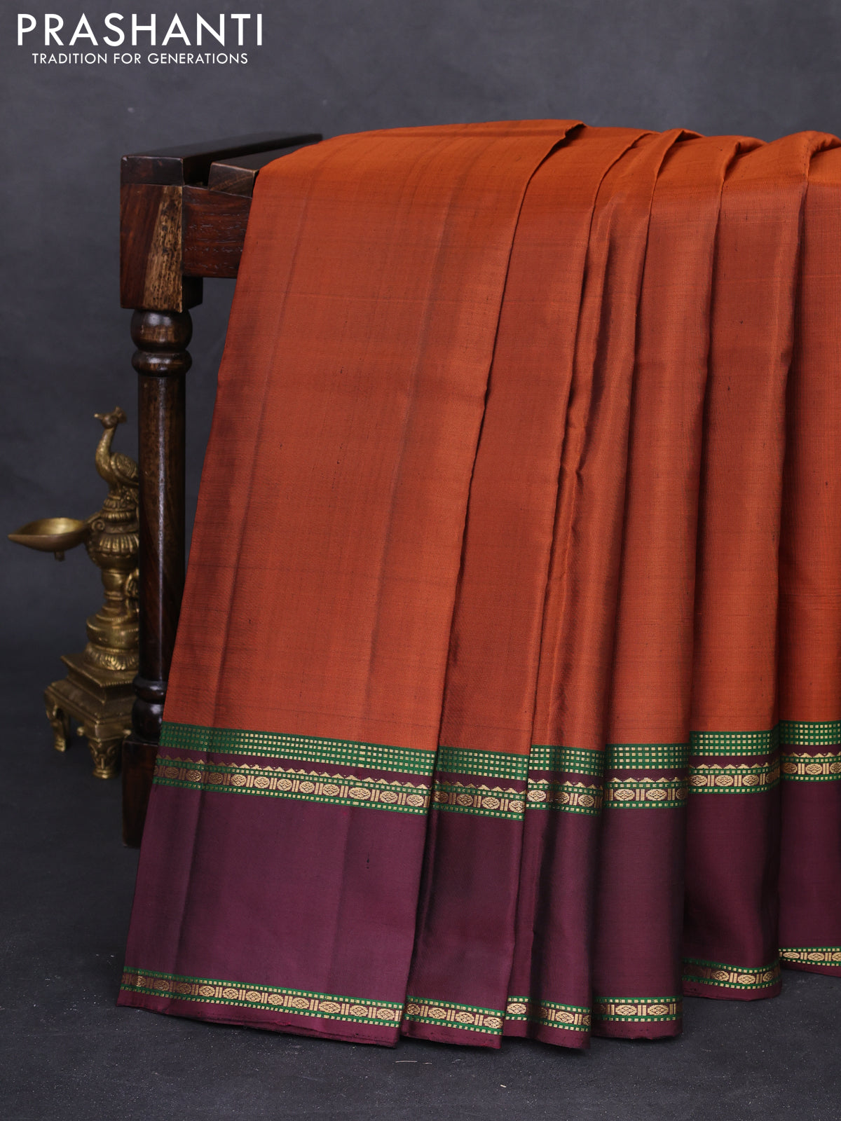 Pure kanchipuram silk saree rustic orange and deep maroon with plain body and rettapet zari woven border