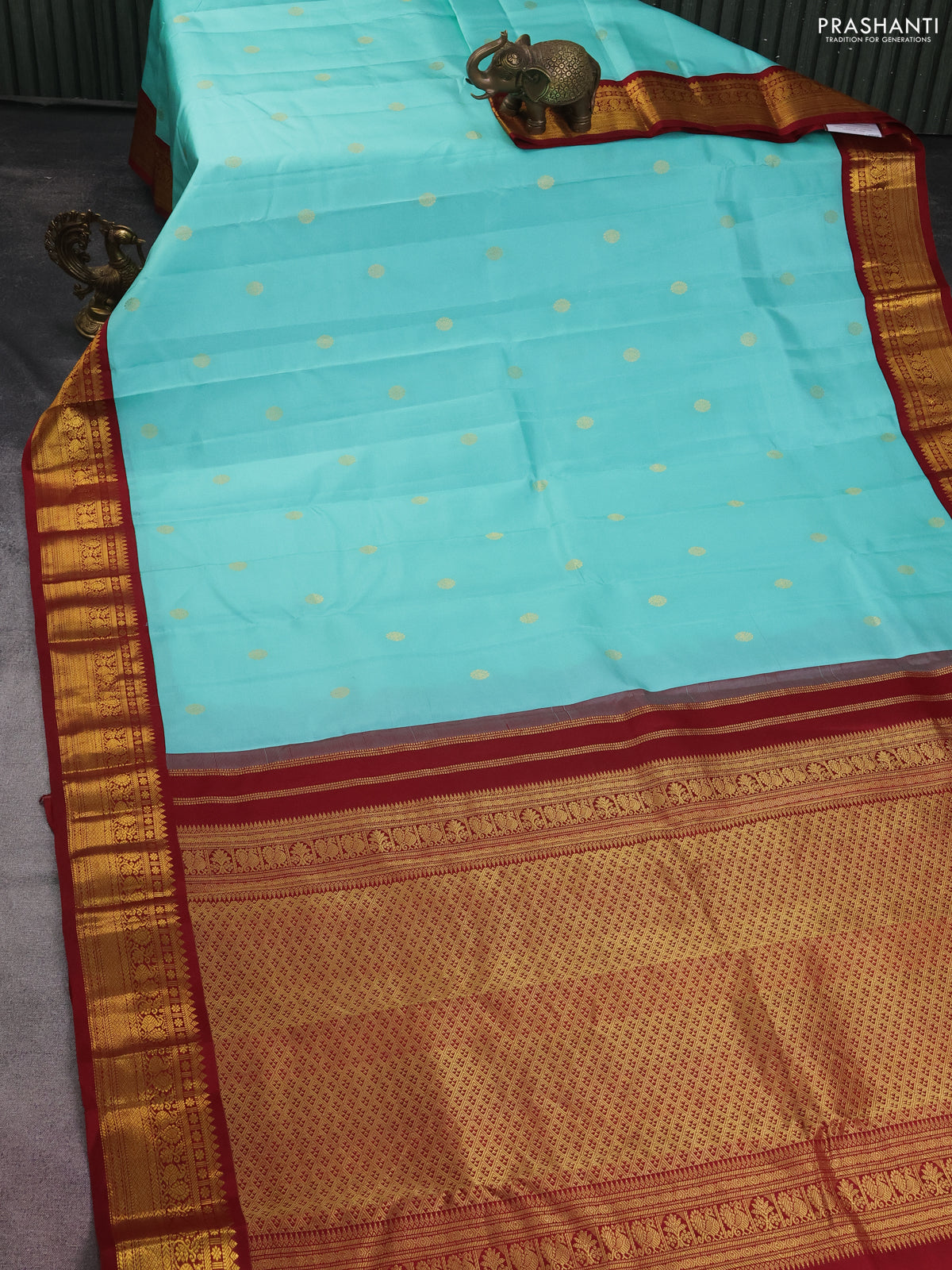 Pure kanchipuram silk saree teal blue and maroon with zari woven buttas and zari woven korvai border
