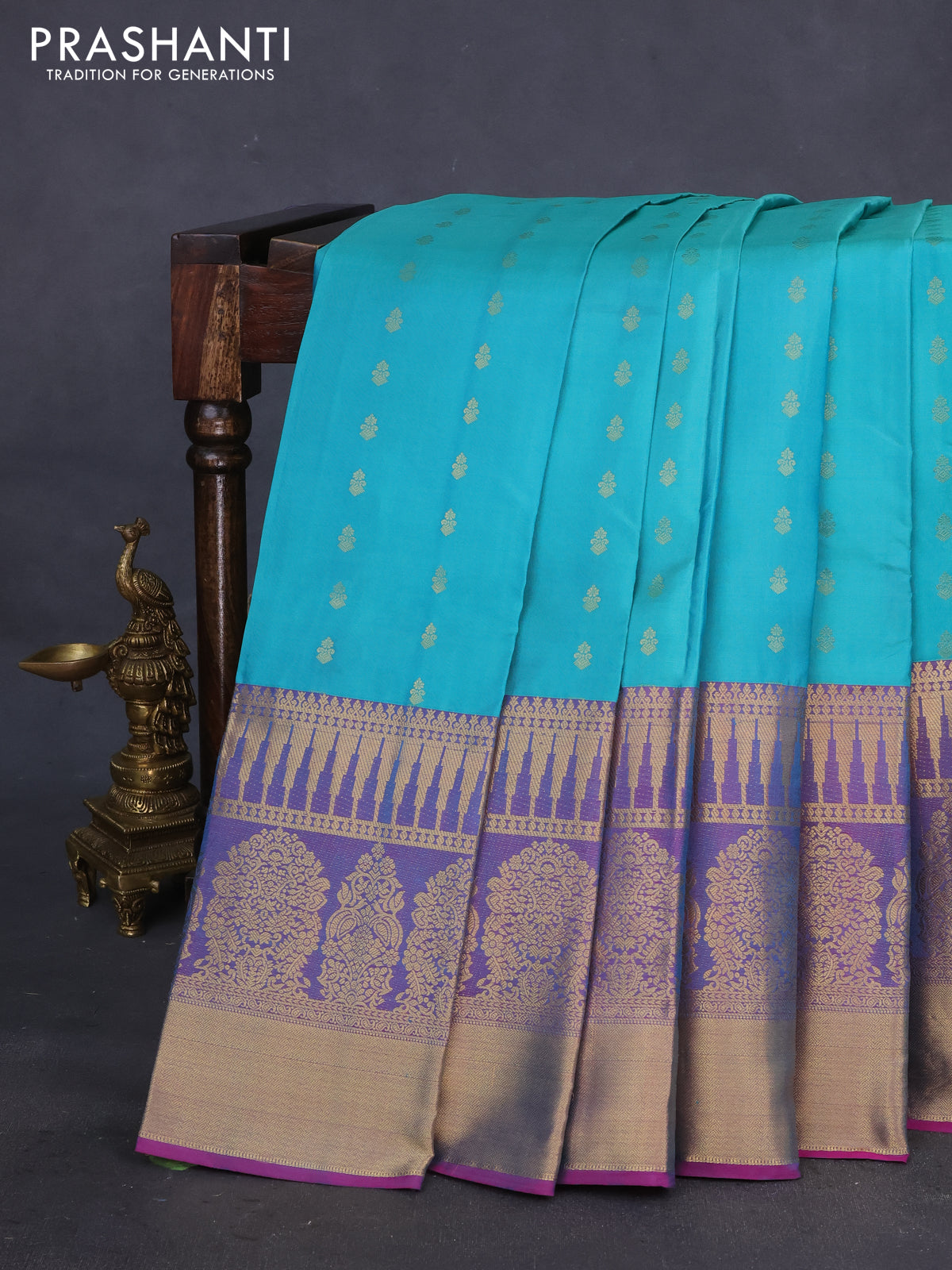 Pure kanchipuram silk saree teal blue shade and dual shade of pink with allover zari woven buttas and long zari woven border