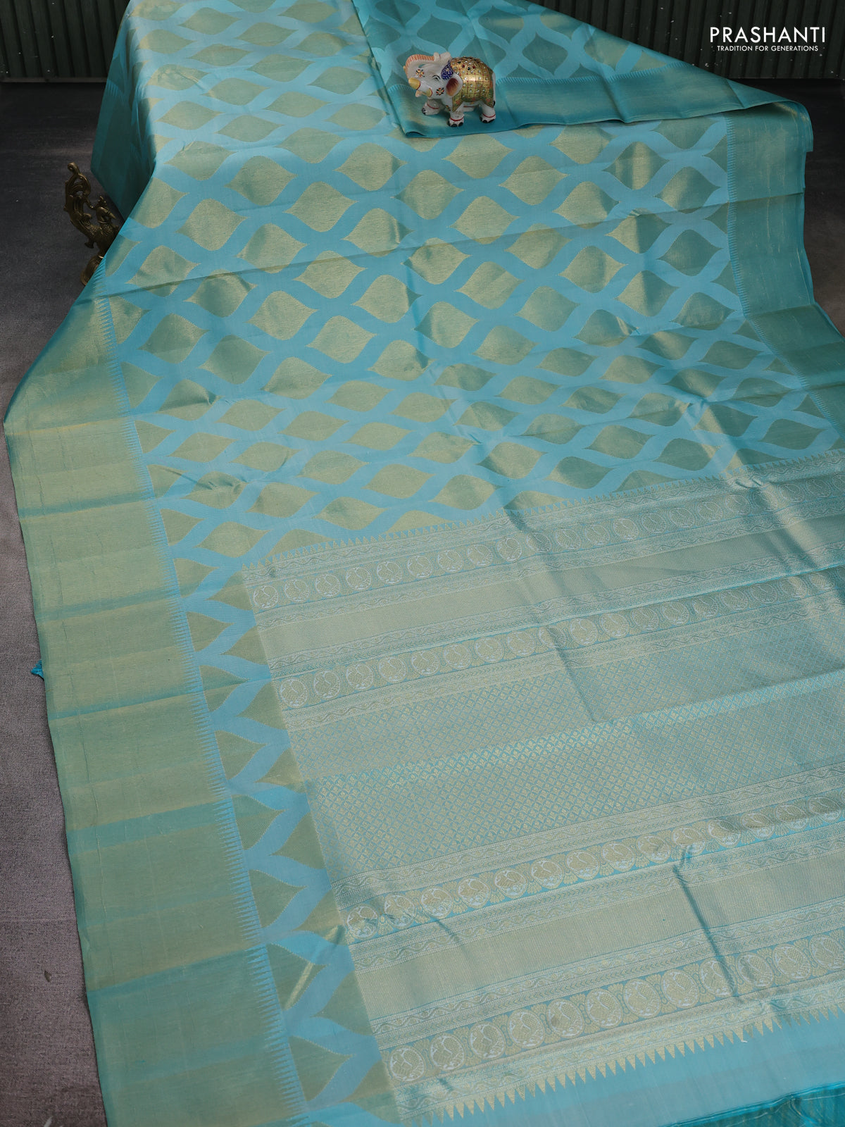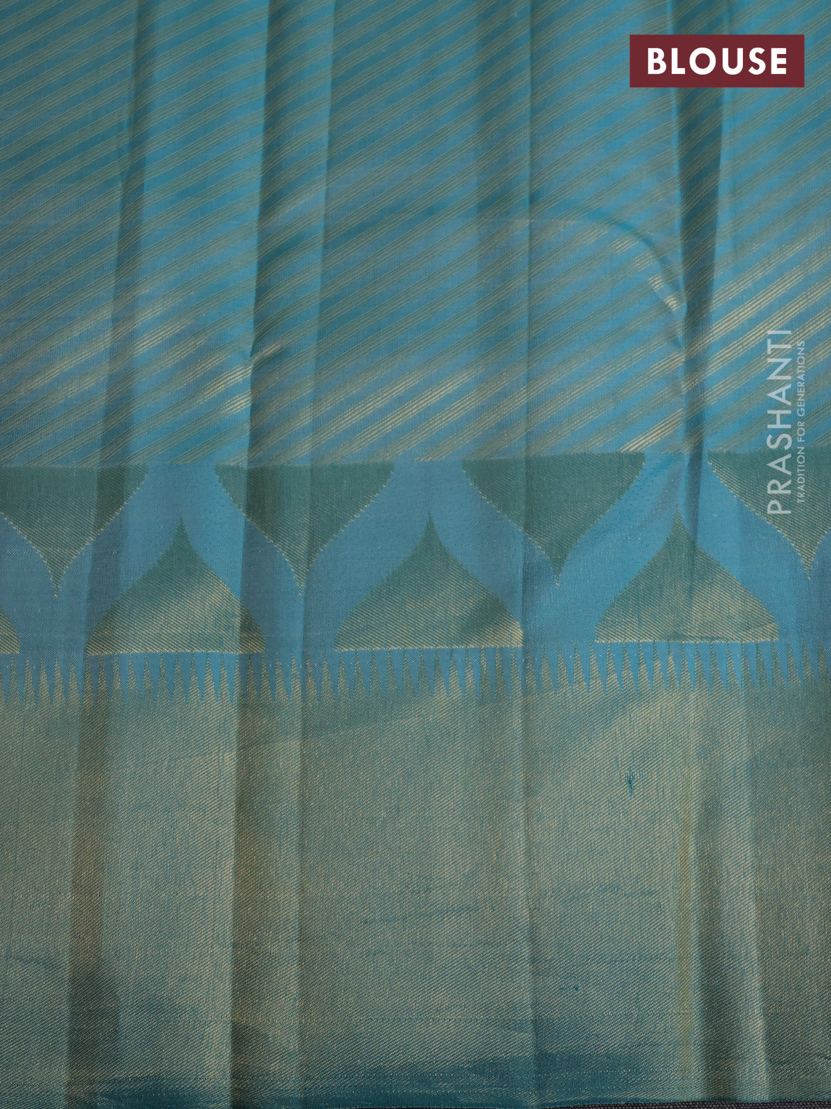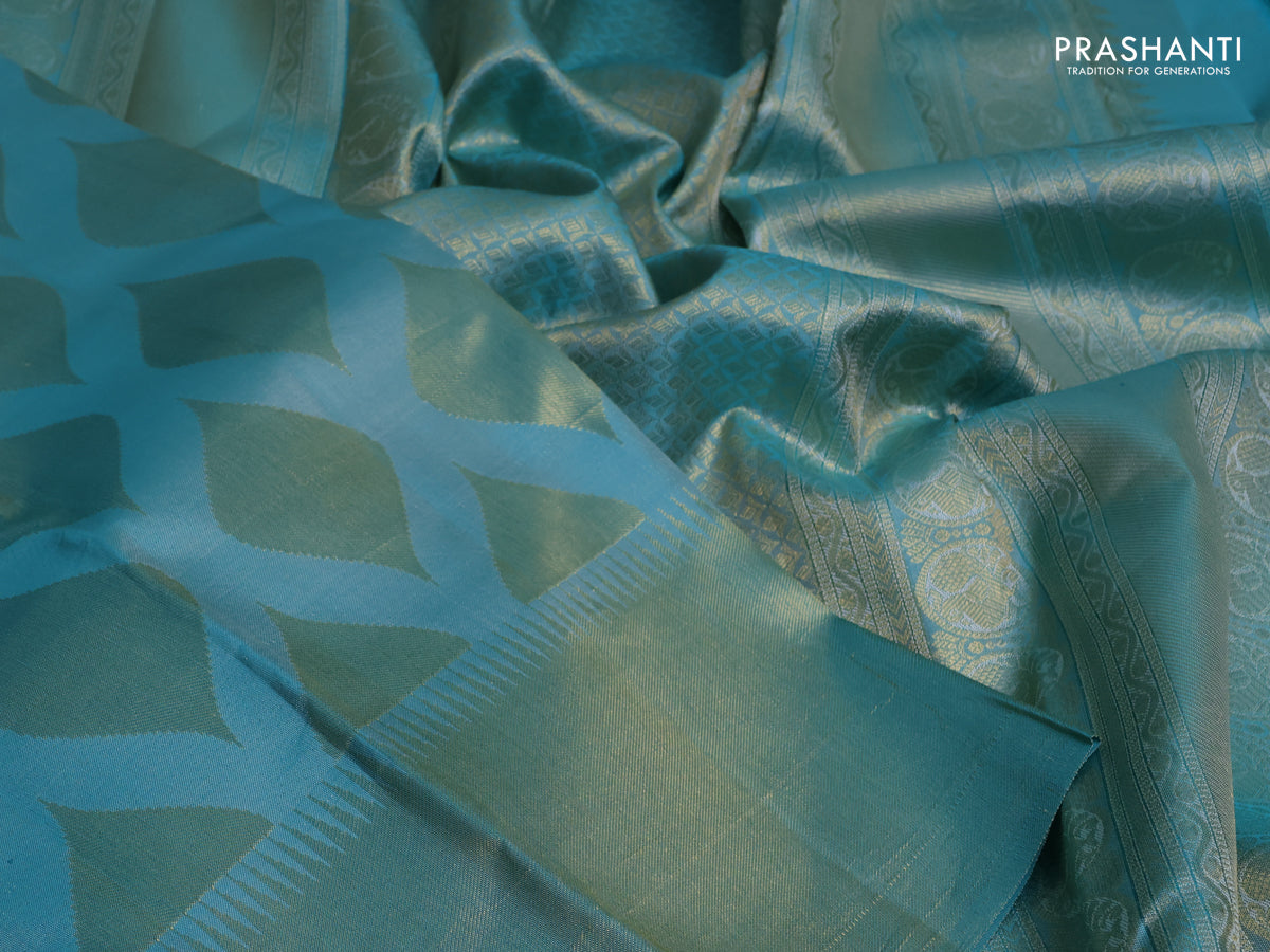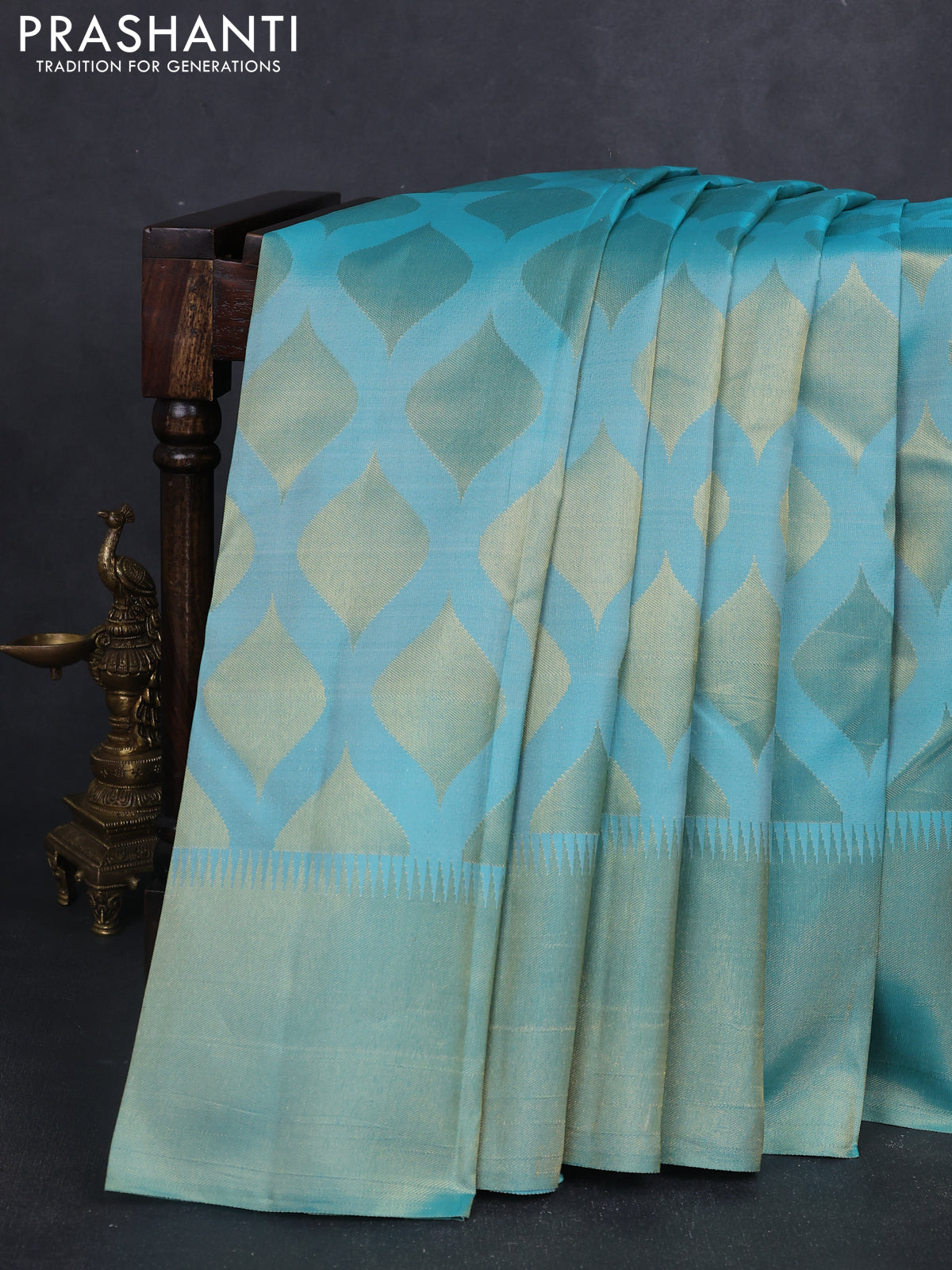 Pure kanchipuram silk saree teal blue with allover zari woven geometric butta weaves and temple design zari woven border
