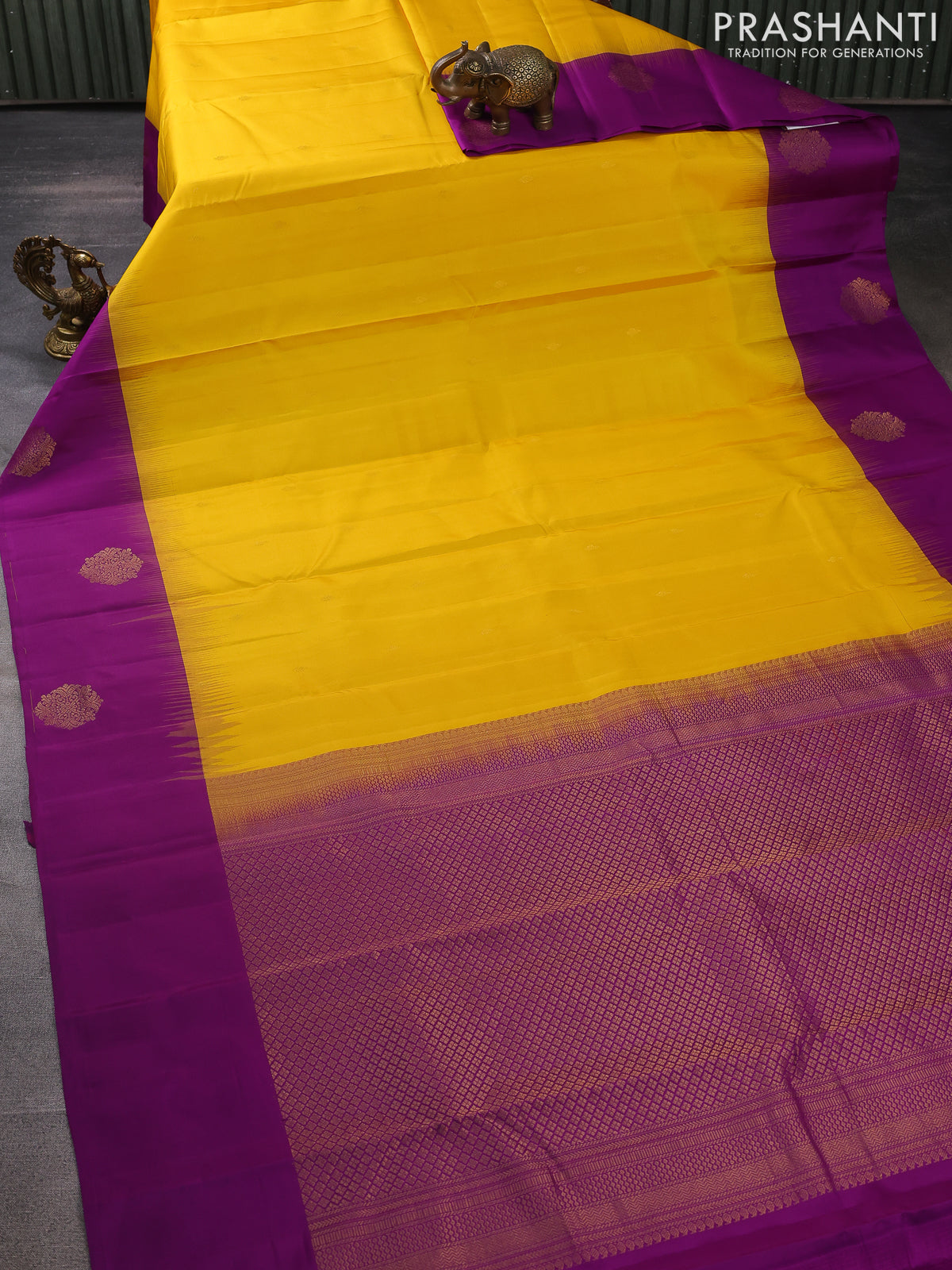 Pure kanchipuram silk saree yellow and deep purple with zari woven buttas and zari woven butta border