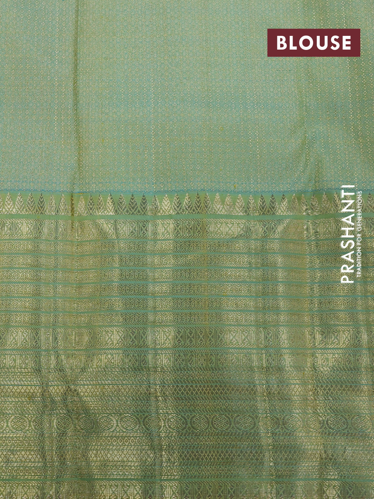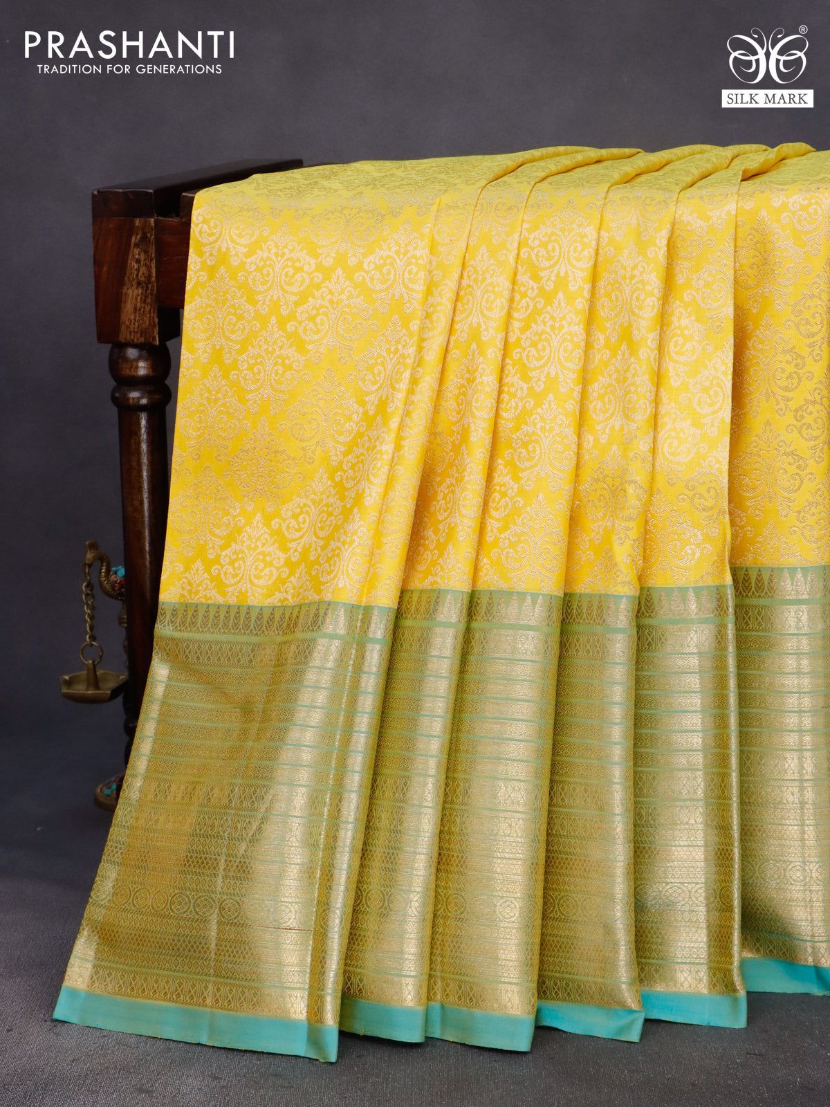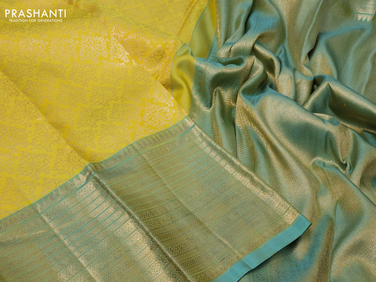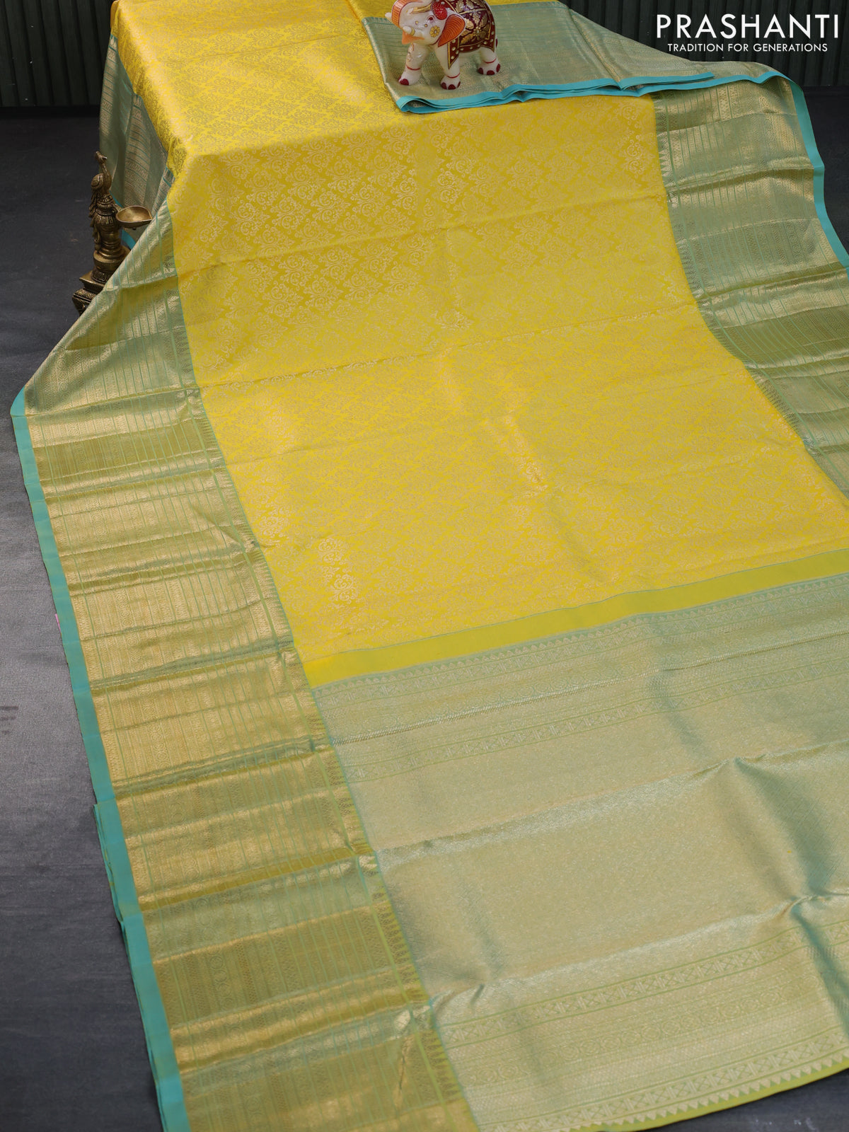 Pure kanchipuram silk saree yellow and dual shade of teal blue with allover zari woven brocade weaves and zari woven border