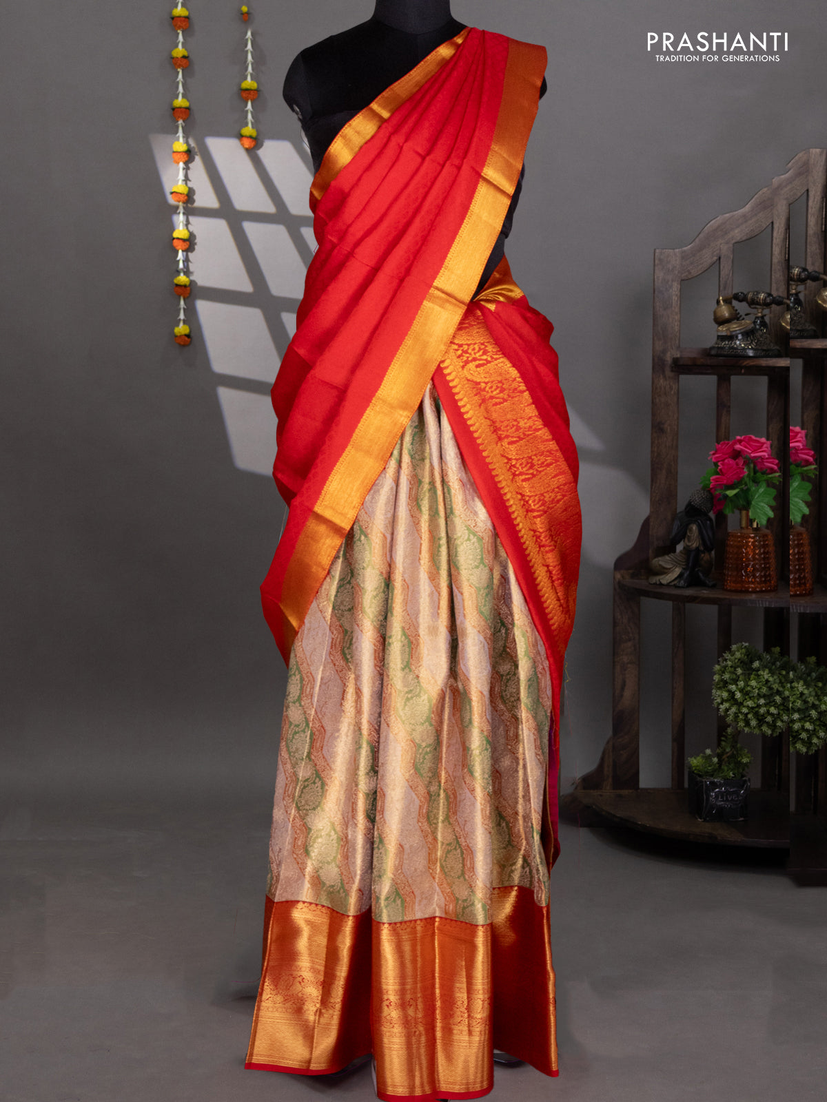 Pure kanchipuram tissue silk lehenga multi colour and red with allover brocade weaves and long zari woven border