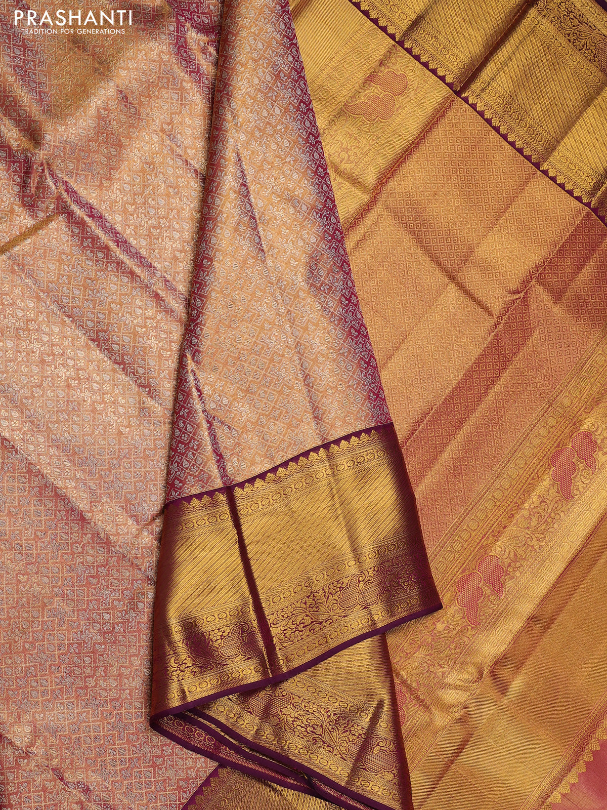 Pure kanchipuram tissue silk saree dual shade of gold and purple with allover zari woven brocade weaves and long zari woven border