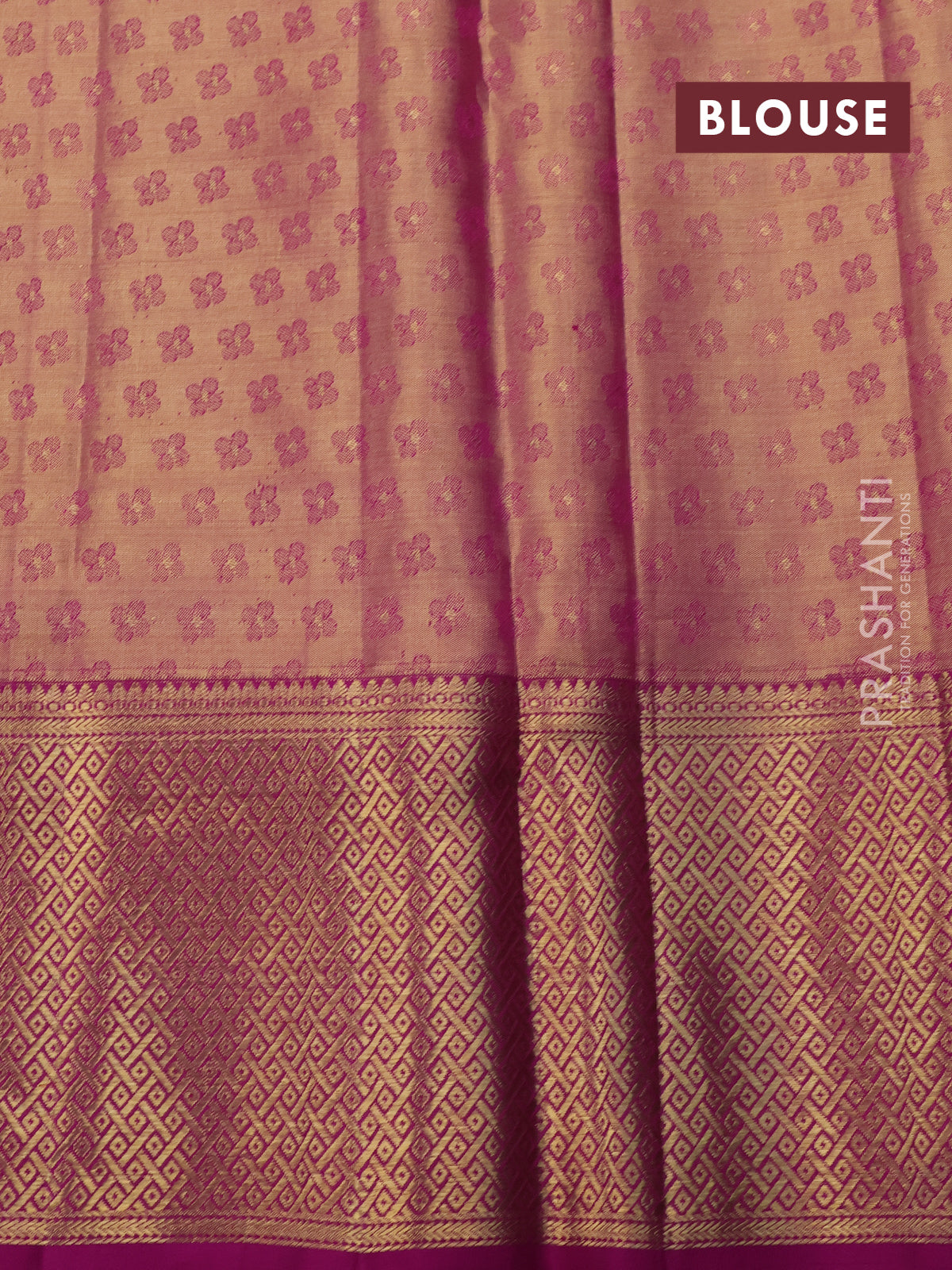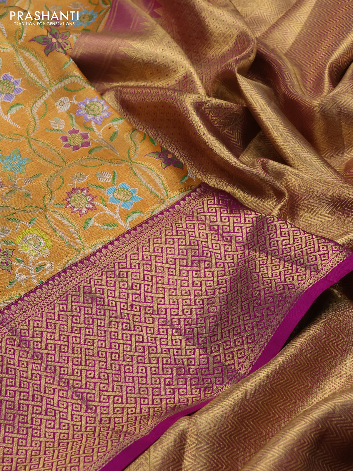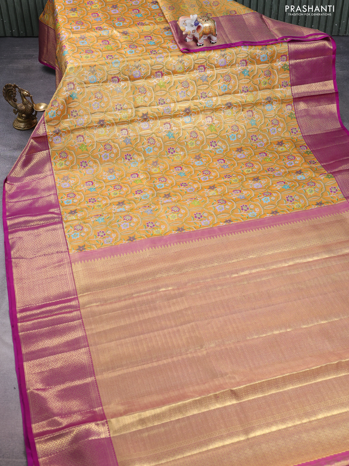 Pure kanchipuram tissue silk saree gold and purple with allover zari woven floral design mina weaves and zari woven border