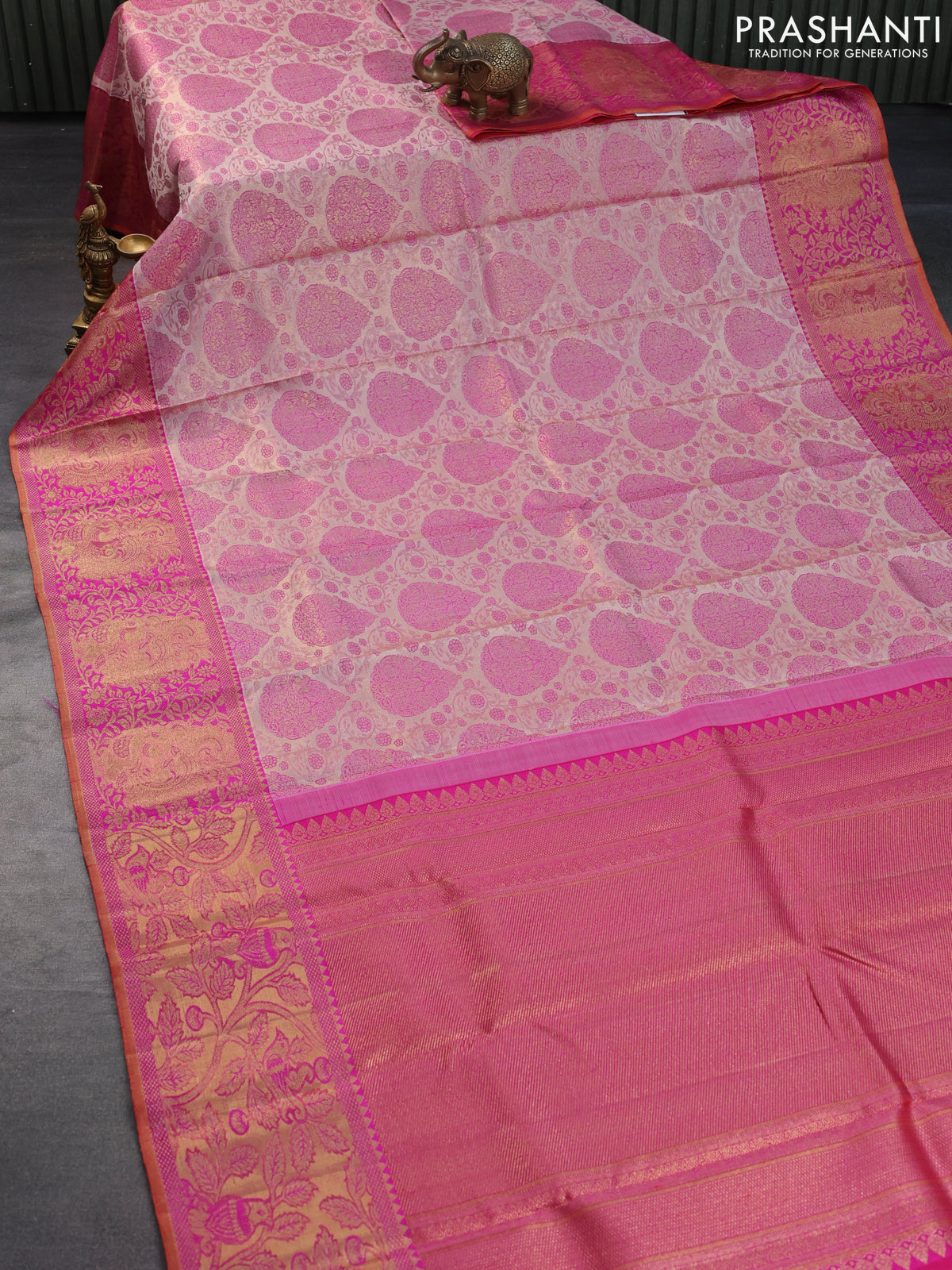 Pure kanchipuram tissue silk saree grey and pink with allover zari woven brocade weaves and zari woven border