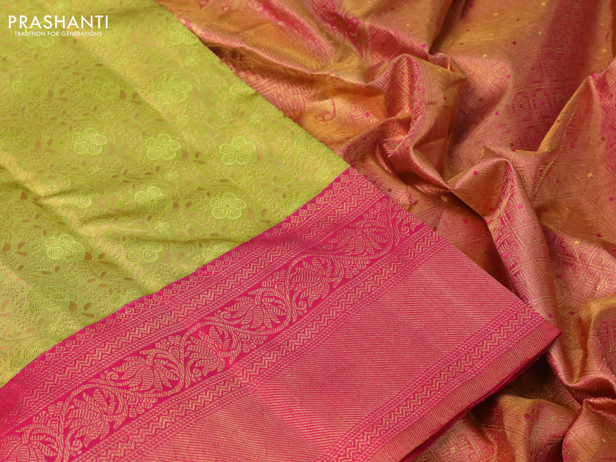 Pure kanchipuram tissue silk saree light green and pink with allover zari woven brocade weaves and zari woven border