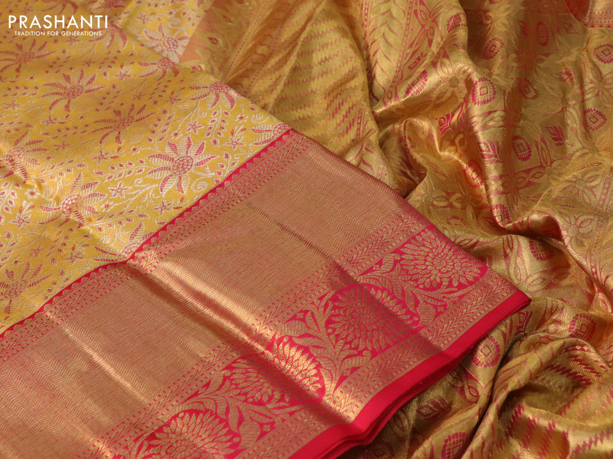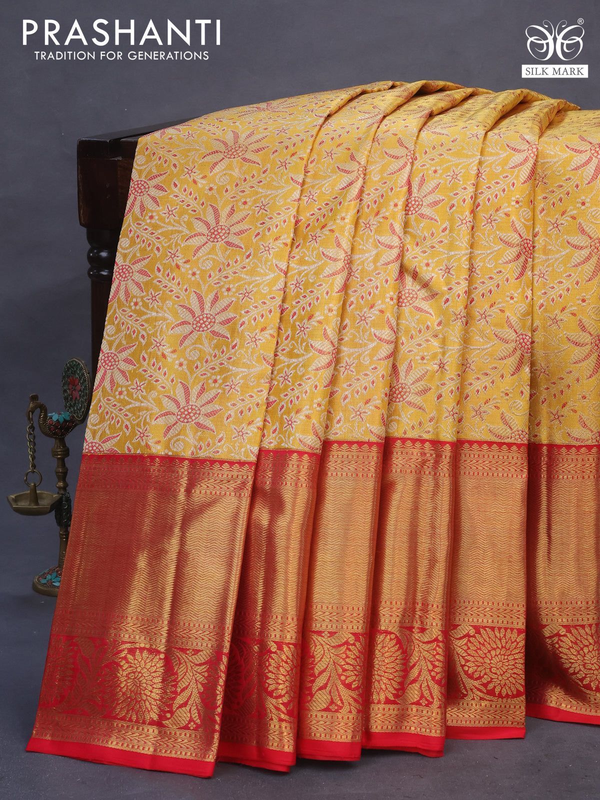 Pure kanchipuram tissue silk saree yellow and red with allover zari woven brocade weaves and long zari woven border