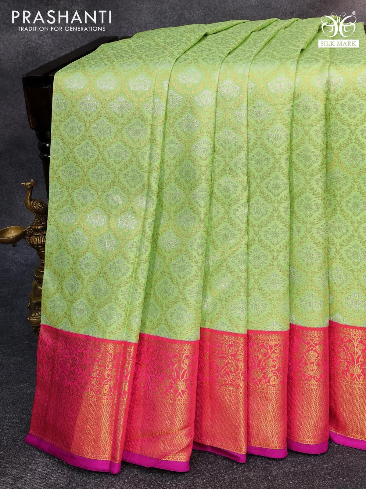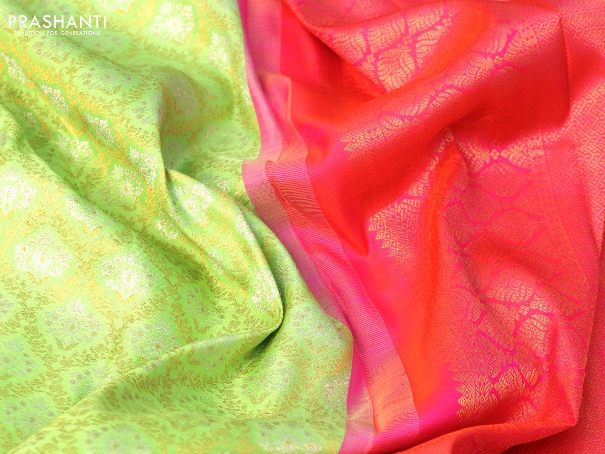 Pure kanjivaram silk saree pista green and dual shade of pinkish orange with allover silver & gold zari woven brocade weaves and floral zari woven korvai border