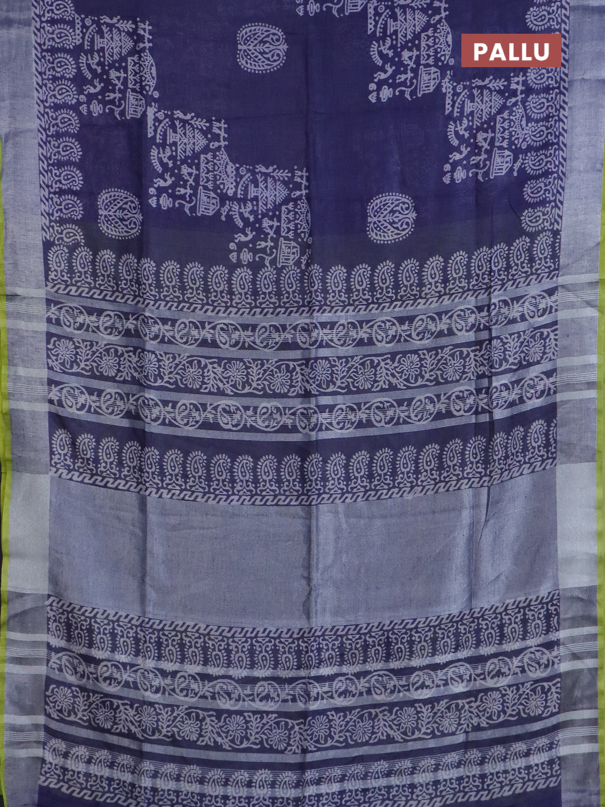 Pure linen saree blue shade and yellow with allover prints and silver zari woven border