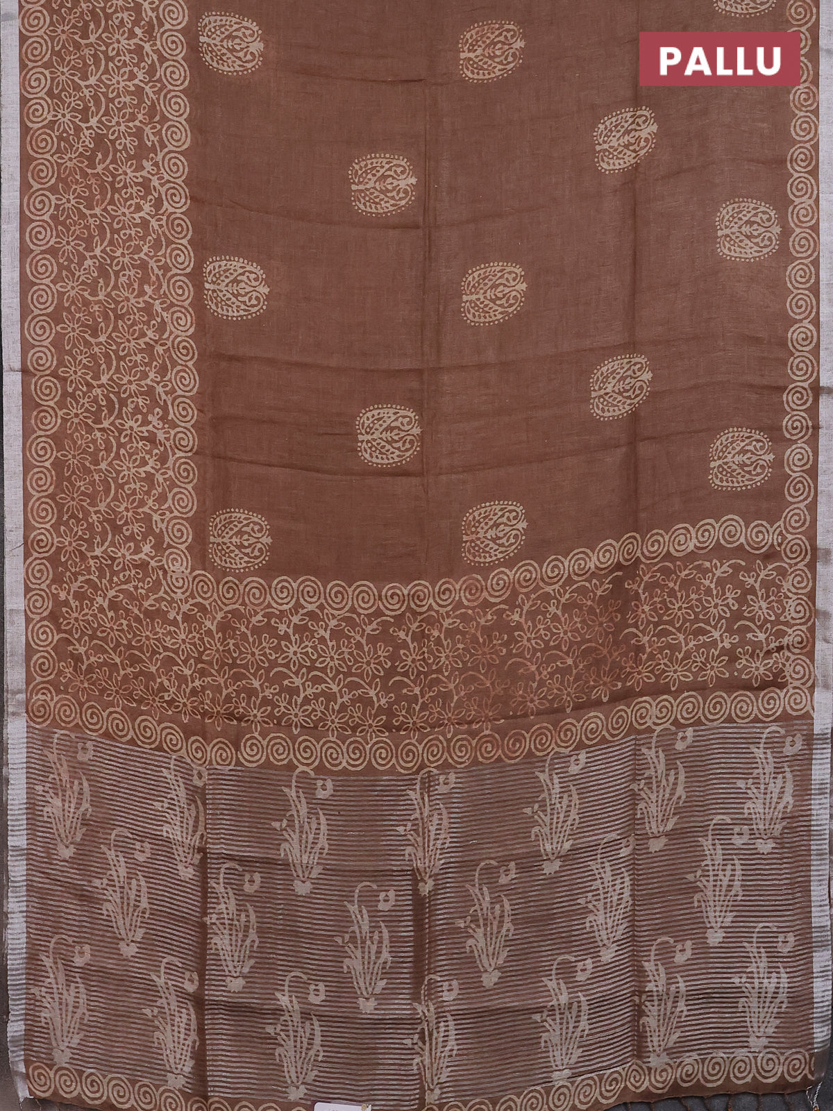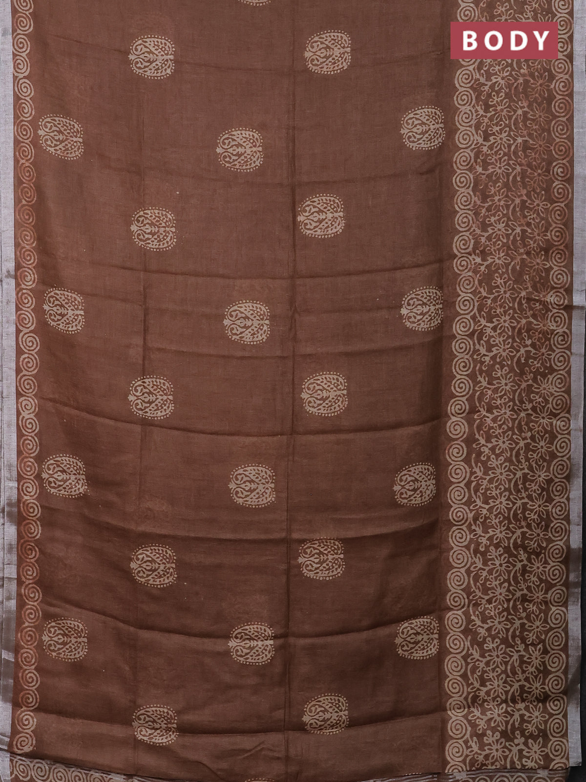Pure linen saree brown shade with allover butta prints and silver zari woven border