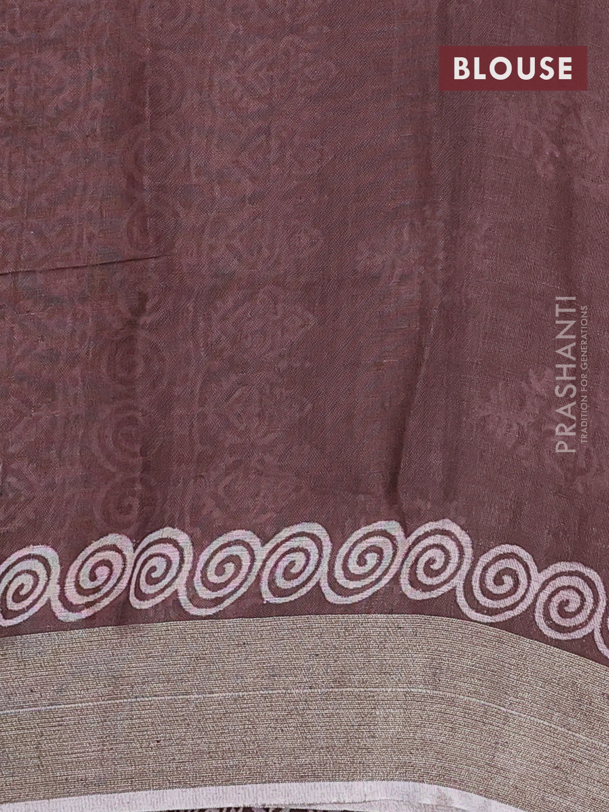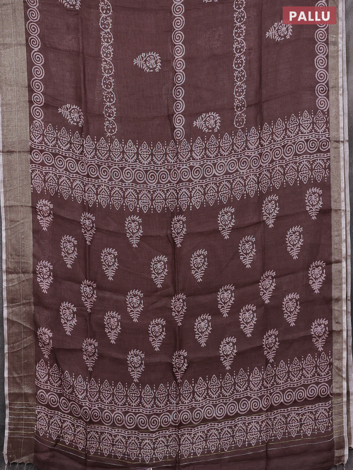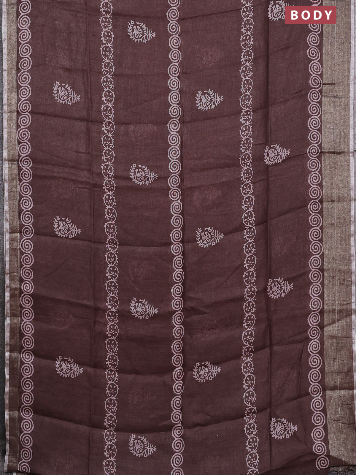Pure linen saree brown with butta prints and silver zari woven border