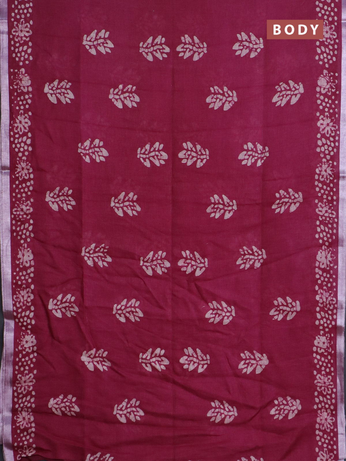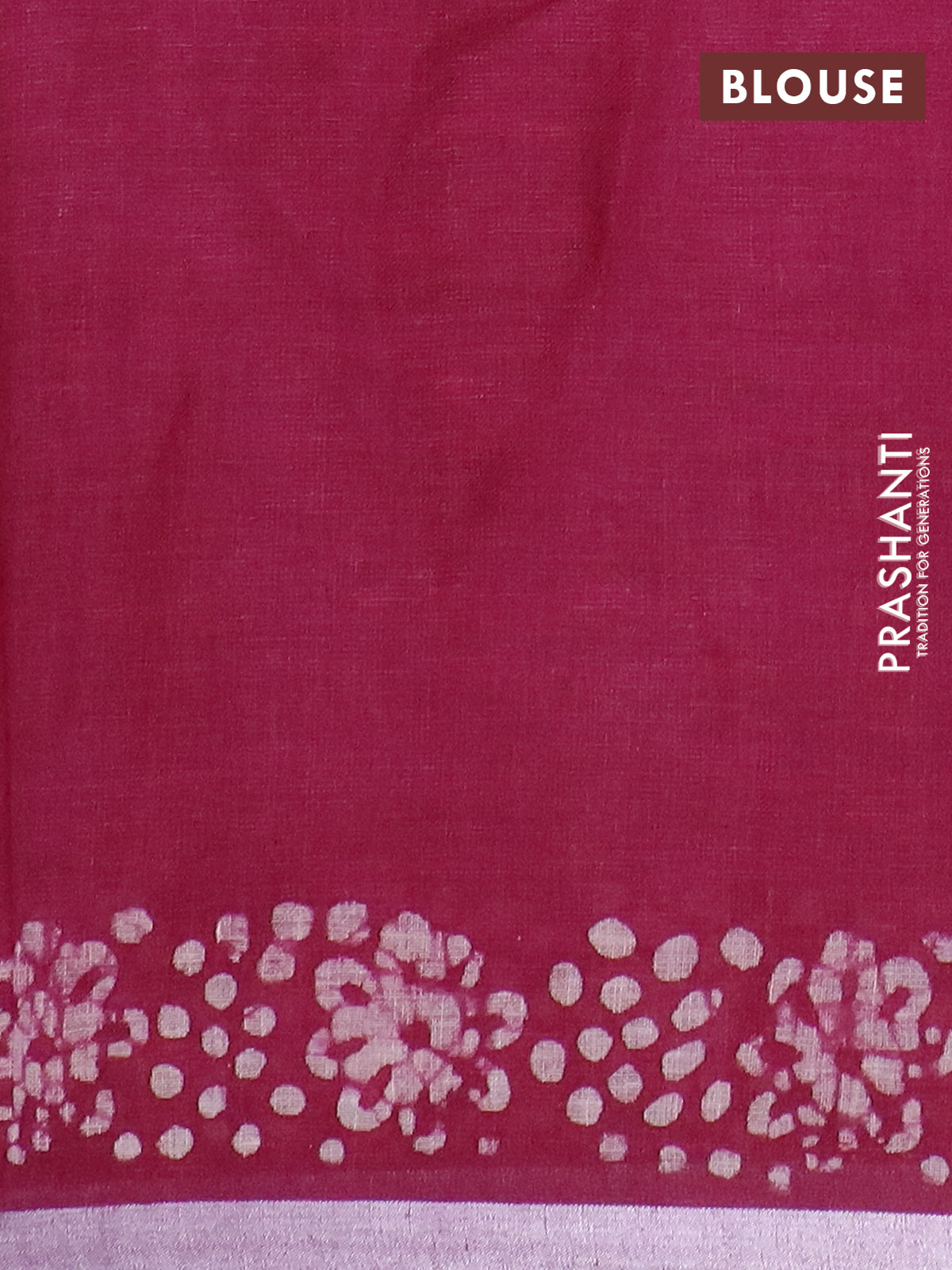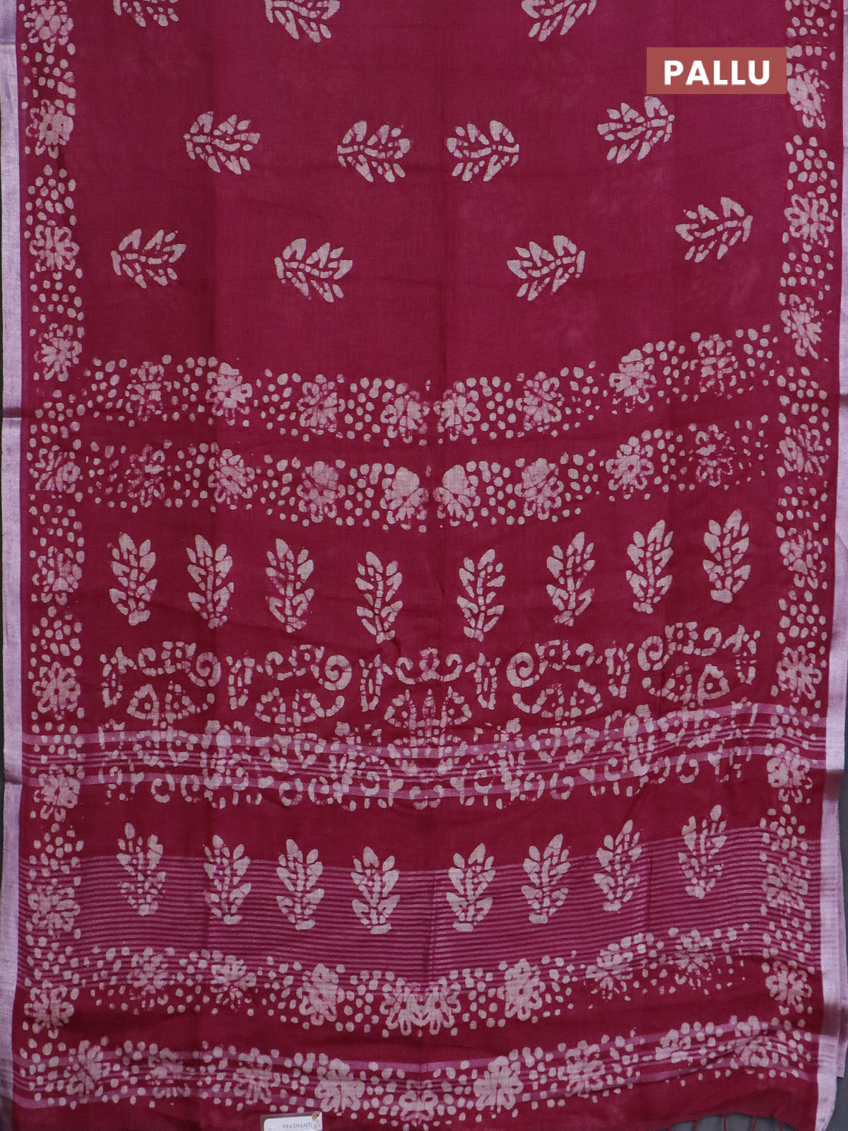 Pure linen saree dark magenta pink with batik butta prints and silver zari woven border