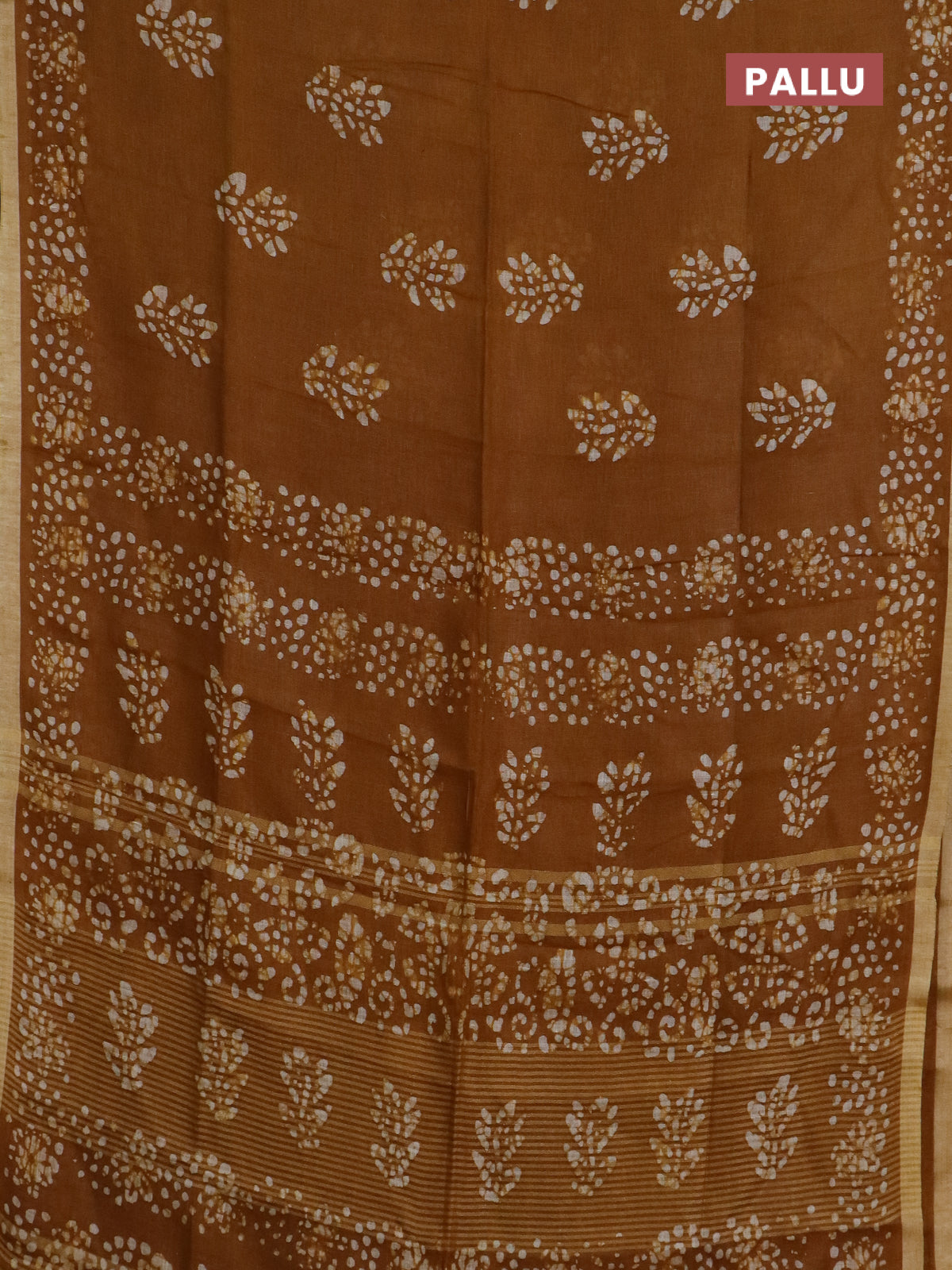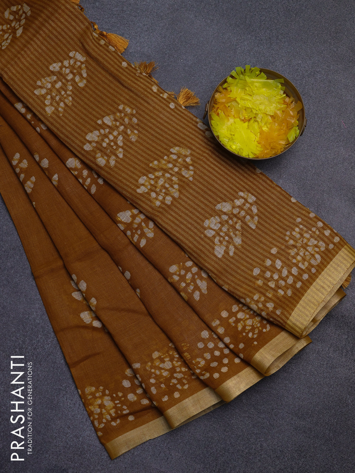 Pure linen saree dark mustard with allover batik butta prints and silver zari woven border