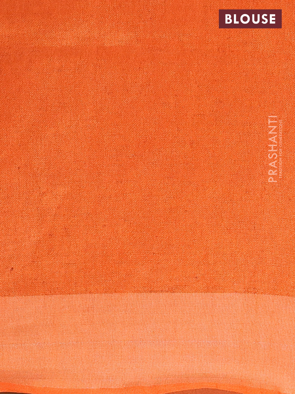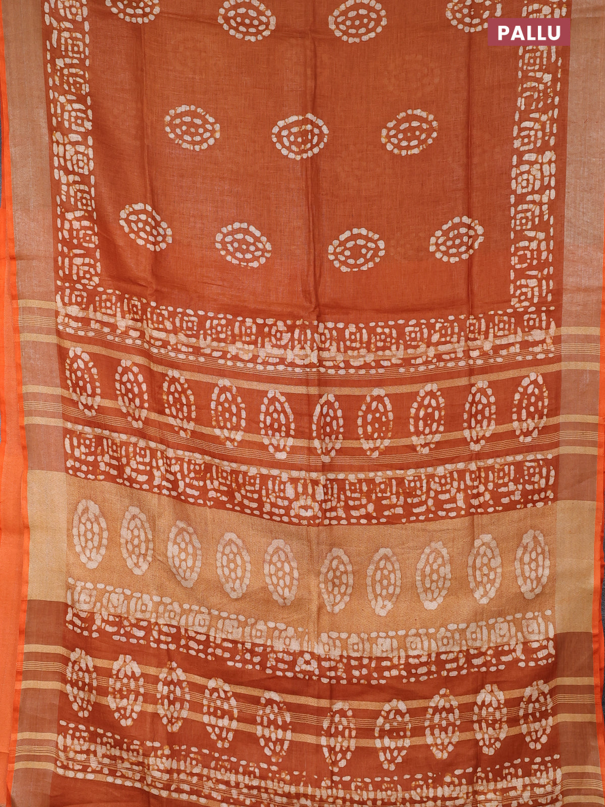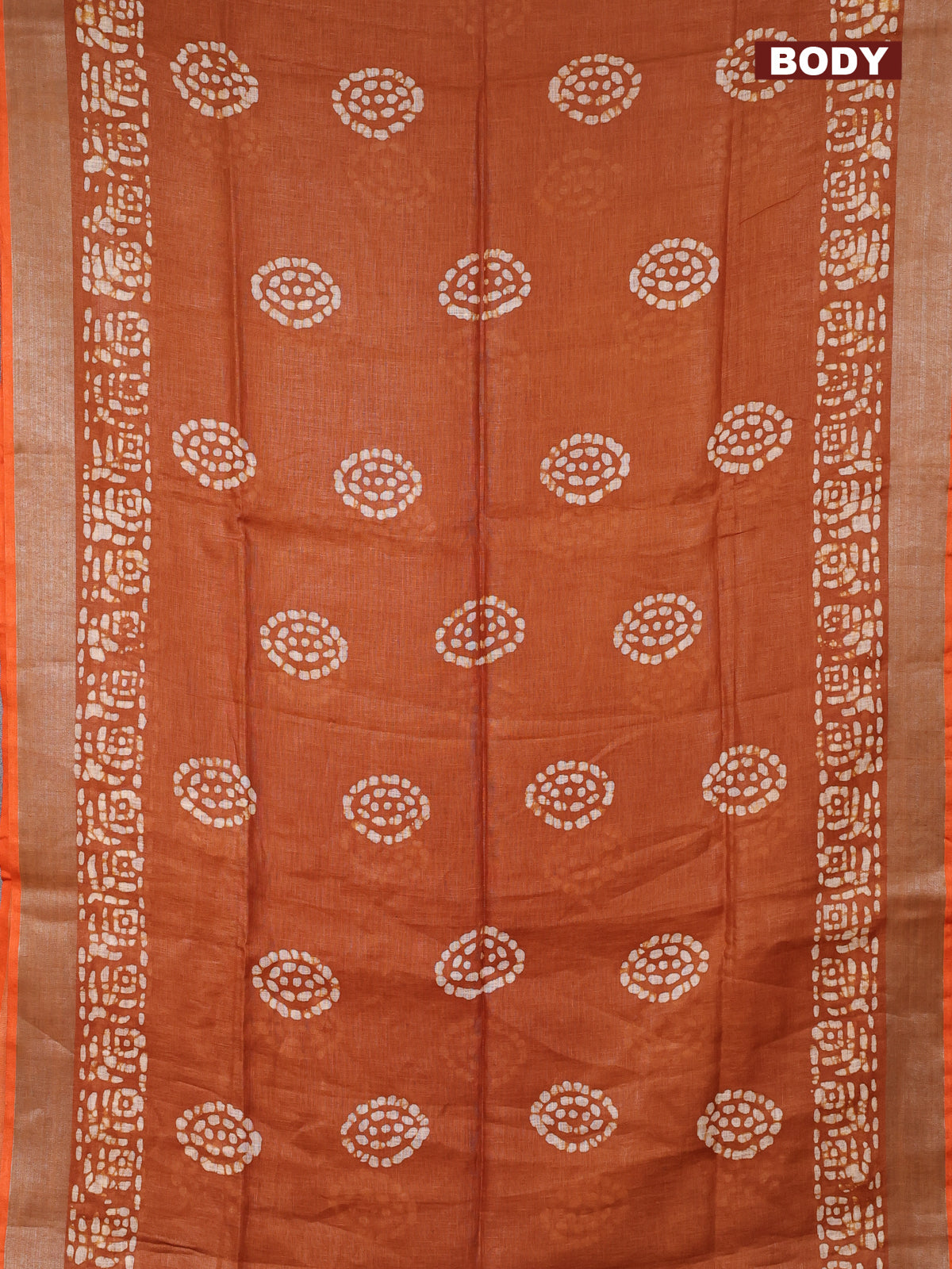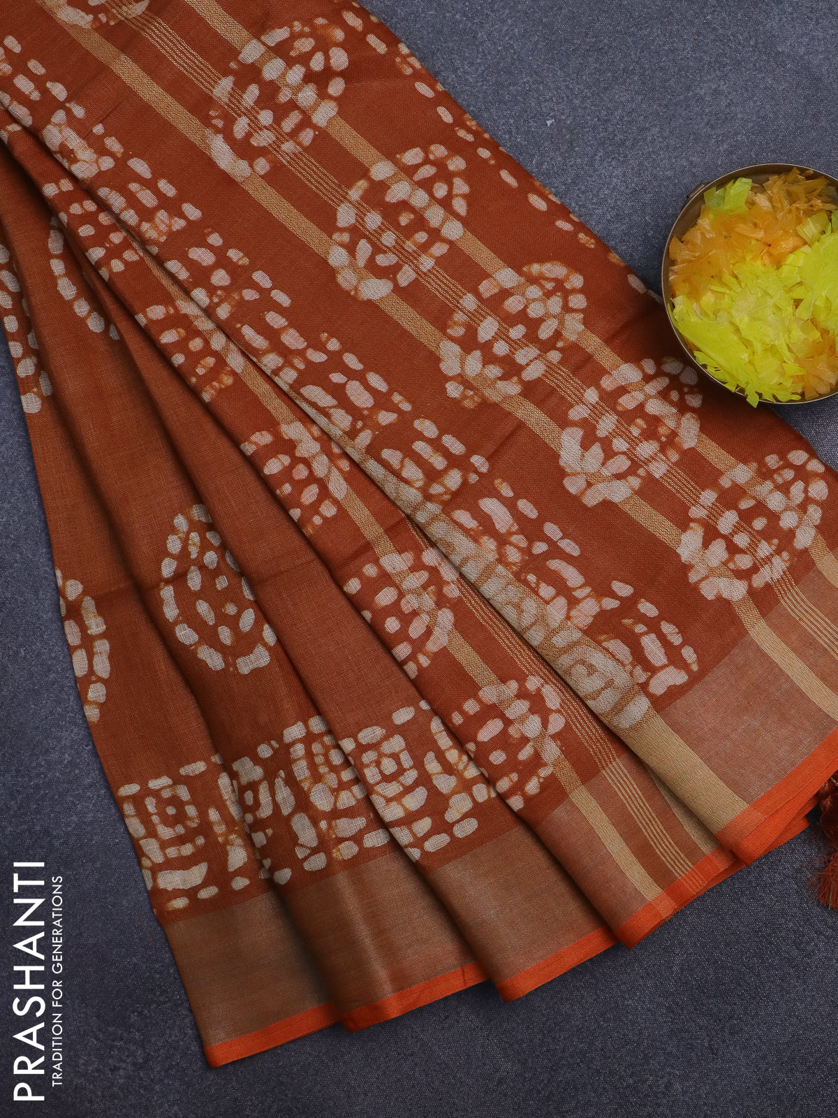 Pure linen saree dark mustard with batik butta prints and silver zari woven border