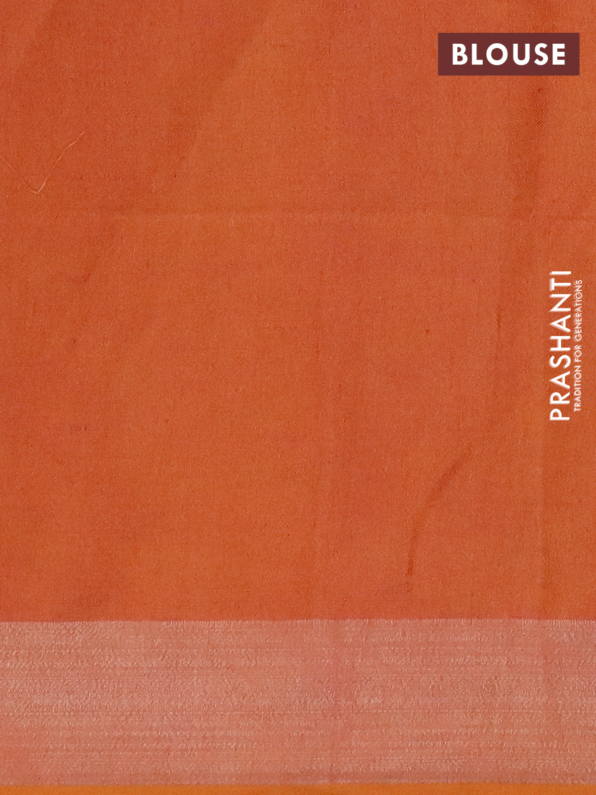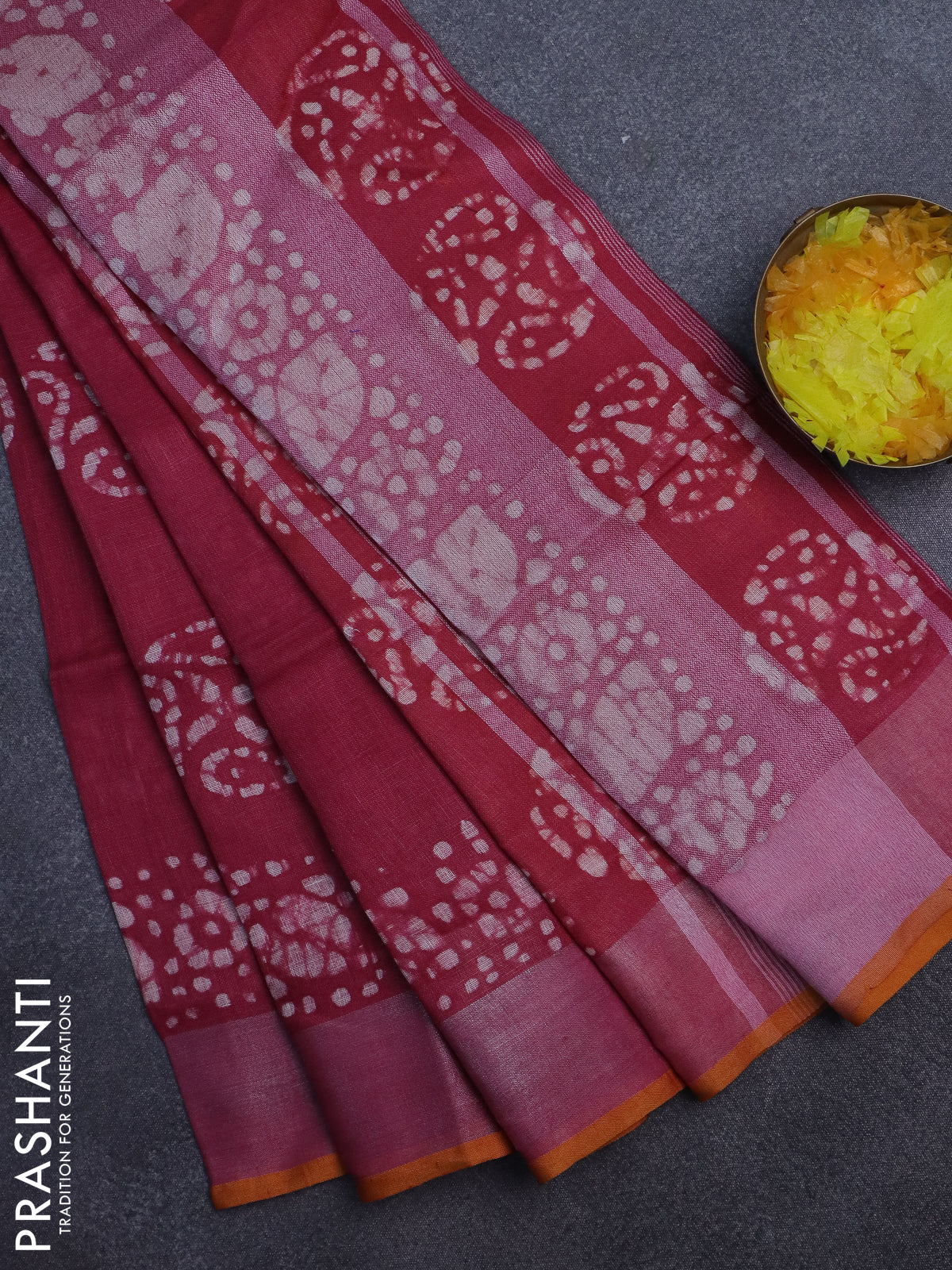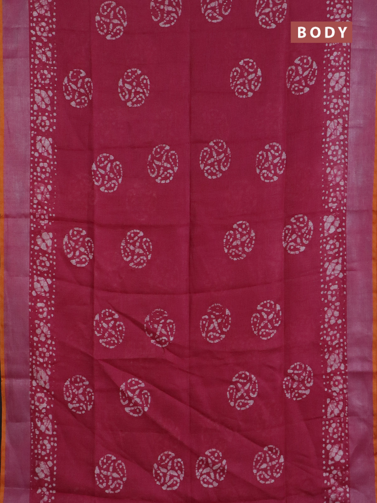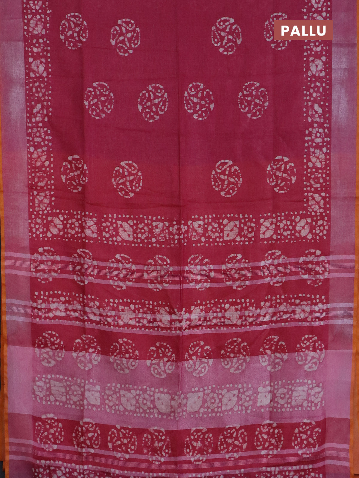 Pure linen saree dark pink and mustard yellow with batik butta prints and silver zari woven border